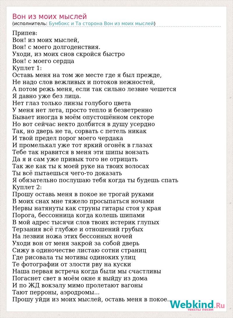 Припев: Вон! из моих мыслей, Вон! с моего долгоденствия. Уходи, из моих снов скройся быстро Вон! с моего сердца Куплет 1: Оставь меня на том же месте где я был прежде, Не надо слов вежливых и потоков нежностей, А потом режь меня, если так сильно лезвие чешется Я давно уже без лица. Нет глаз только линзы голубого цвета У меня нет лета, просто тепло и безветренно Бывает иногда в моём опустошённом секторе Но вот сейчас некто долбится в душу усердно Так, но дверь не та, сорвать с петель никак И твой предел порог моего чердака И промелькал уже тот яркий огонёк в глазах Тебе так нравится в меня эти шипы вонзать Да я и сам уже привык того не отрицать Так же как ты к моей руке на твоих волосах Ты всё пытаешься чего-то доказать Я обязательно послушаю тебя когда ты будешь спать Куплет 2: Прошу оставь меня в покое не трогай руками В моих снах мне тяжело просыпаться ночами Нервы натянуты как струны гитары стоя у края Порога, бессонница когда колешь шипами В мой адрес тысячи слов твоих истерик глупых Терзания всё глубже и отношений грубых На лезвии ножа этих бессонных ночей Уходи вон от меня закрой за собой дверь Сижу в одиночестве листаю сотни страниц Где рисовала ты мотивы одиноких улиц Те фотографии от злости рву на куски Наша первая встреча когда были мы счастливы Погаснет свет в моём окне я выйду из дома И по ЖД вокзалу мимо пролетают вагоны Тают перроны, аэродромы... Прошу уйди из моих мыслей, оставь меня в покое...