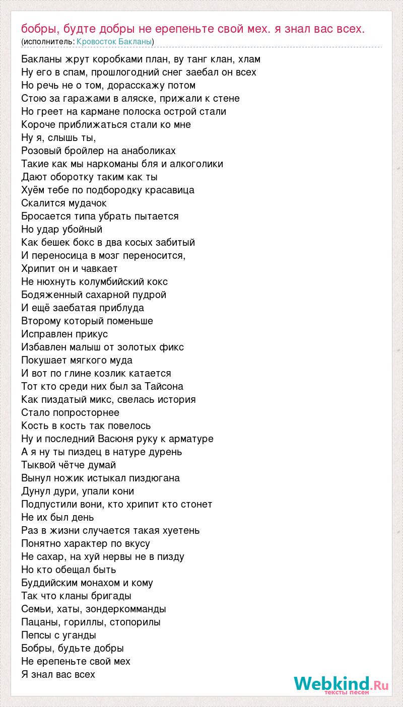 Бакланы жрут коробками план, ву танг клан, хлам Нy его в спам, прошлогодний снег заебал он всех Но речь не о том, дорасскажу потом Стою за гаражами в аляске, прижали к стене Но греет на кармане полоска острой стали Короче приближаться стали ко мне Ну я, слышь ты, Розовый бройлер на анаболиках Такие как мы наркоманы бля и алкоголики Дают оборотку таким как ты Хуём тебе по подбородку красавица Скалится мудачок Бросается типа убрать пытается Но удар убойный Как бешек бокс в два косых забитый И переносица в мозг переносится, Хрипит он и чавкает Не нюхнуть колумбийский кокс Бодяженный сахарной пудрой И ещё заебатая приблуда Второму который поменьше Исправлен прикус Избавлен малыш от золотых фикс Покушает мягкого муда И вот по глине козлик катается Тот кто среди них был за Тайсона Как пиздатый микс, свелась история Стало попросторнее Кость в кость так повелось Ну и последний Васюня руку к арматуре А я ну ты пиздец в натуре дурень Тыквой чётче думай Вынул ножик истыкал пиздюгана Дунул дури, упали кони Подпустили вони, кто хрипит кто стонет Не их был день Раз в жизни случается такая хуетень Понятно характер по вкусу Не сахар, на хуй нервы не в пизду Но кто обещал быть Буддийским монахом и кому Так что кланы бригады Семьи, хаты, зондеркомманды Пацаны, гориллы, стопорилы Пепсы с уганды Бобры, будьте добры Не ерепеньте свой мех Я знал вас всех