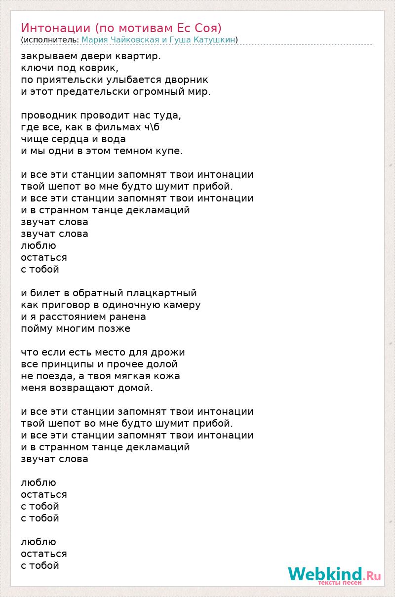 закрываем двери квартир. ключи под коврик, по приятельски улыбается дворник и этот предательски огромный мир. проводник проводит нас туда, где все, как в фильмах ч\б чище сердца и вода и мы одни в этом темном купе. и все эти станции запомнят твои интонации твой шепот во мне будто шумит прибой. и все эти станции запомнят твои интонации и в странном танце декламаций звучат слова звучат слова люблю остаться с тобой и билет в обратный плацкартный как приговор в одиночную камеру и я расстоянием ранена пойму многим позже что если есть место для дрожи все принципы и прочее долой не поезда, а твоя мягкая кожа меня возвращают домой. и все эти станции запомнят твои интонации твой шепот во мне будто шумит прибой. и все эти станции запомнят твои интонации и в странном танце декламаций звучат слова люблю остаться с тобой с тобой люблю остаться с тобой