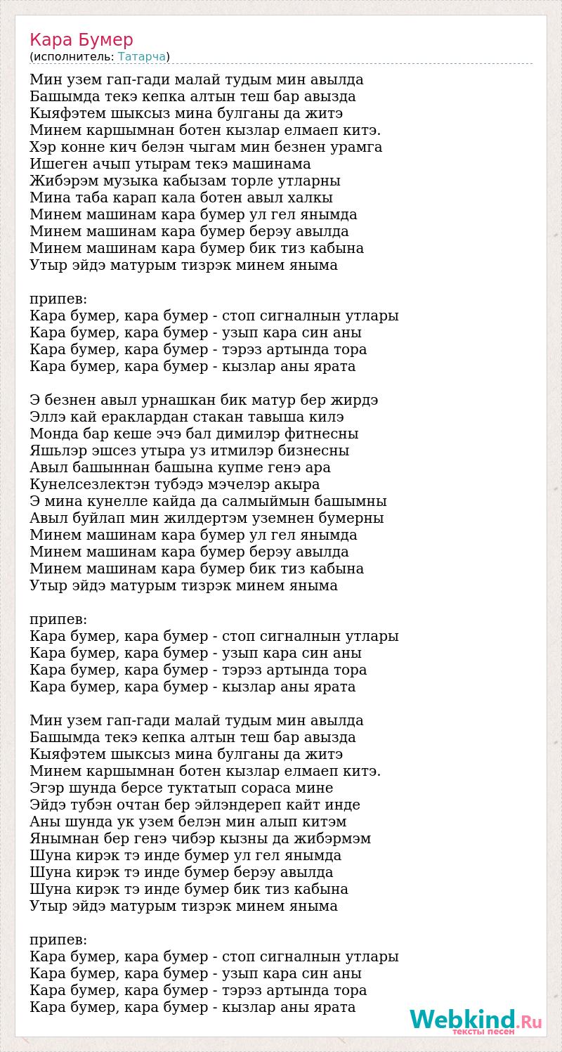 Мин узем гап-гади малай тудым мин авылда Башымда текэ кепка алтын теш бар авызда Кыяфэтем шыксыз мина булганы да житэ Минем каршымнан ботен кызлар елмаеп китэ. Хэр конне кич белэн чыгам мин безнен урамга Ишеген ачып утырам текэ машинама Жибэрэм музыка кабызам торле утларны Мина таба карап кала ботен авыл халкы Минем машинам кара бумер ул гел янымда Минем машинам кара бумер берэу авылда Минем машинам кара бумер бик тиз кабына Утыр эйдэ матурым тизрэк минем яныма припев: Кара бумер, кара бумер - стоп сигналнын утлары Кара бумер, кара бумер - узып кара син аны Кара бумер, кара бумер - тэрэз артында тора Кара бумер, кара бумер - кызлар аны ярата Э безнен авыл урнашкан бик матур бер жирдэ Эллэ кай ераклардан стакан тавыша килэ Монда бар кеше эчэ бал димилэр фитнесны Яшьлэр эшсез утыра уз итмилэр бизнесны Авыл башыннан башына купме генэ ара Кунелсезлектэн тубэдэ мэчелэр акыра Э мина кунелле кайда да салмыймын башымны Авыл буйлап мин жилдертэм уземнен бумерны Минем машинам кара бумер ул гел янымда Минем машинам кара бумер берэу авылда Минем машинам кара бумер бик тиз кабына Утыр эйдэ матурым тизрэк минем яныма припев: Кара бумер, кара бумер - стоп сигналнын утлары Кара бумер, кара бумер - узып кара син аны Кара бумер, кара бумер - тэрэз артында тора Кара бумер, кара бумер - кызлар аны ярата Мин узем гап-гади малай тудым мин авылда Башымда текэ кепка алтын теш бар авызда Кыяфэтем шыксыз мина булганы да житэ Минем каршымнан ботен кызлар елмаеп китэ. Эгэр шунда берсе туктатып сораса мине Эйдэ тубэн очтан бер эйлэндереп кайт инде Аны шунда ук узем белэн мин алып китэм Янымнан бер генэ чибэр кызны да жибэрмэм Шуна кирэк тэ инде бумер ул гел янымда Шуна кирэк тэ инде бумер берэу авылда Шуна кирэк тэ инде бумер бик тиз кабына Утыр эйдэ матурым тизрэк минем яныма припев: Кара бумер, кара бумер - стоп сигналнын утлары Кара бумер, кара бумер - узып кара син аны Кара бумер, кара бумер - тэрэз артында тора Кара бумер, кара бумер - кызлар аны ярата