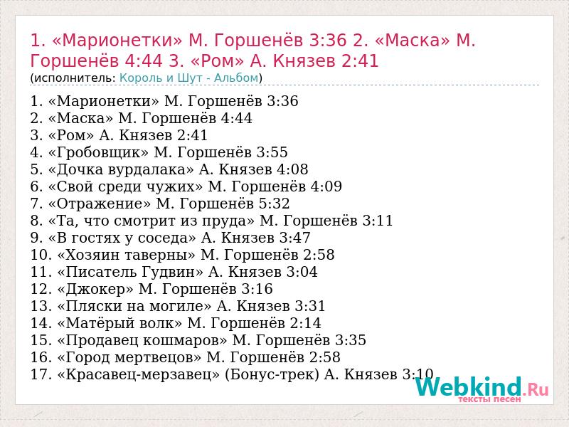 Главная→Исполнители→Король и Шут - Альбом→1. «Марионетки» М. Горшенёв 3:36 2. «Маска» М. Горшенёв 4:44 3. «Ром» А