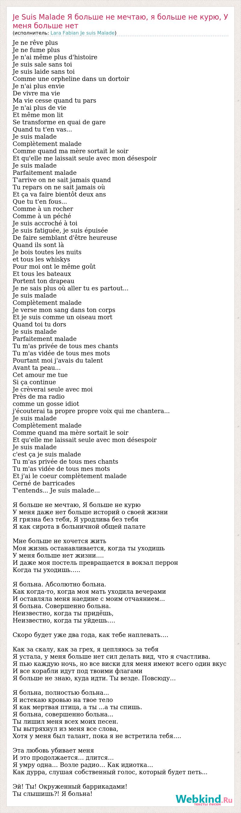 Je ne rêve plus Je ne fume plus Je n'ai même plus d'histoire Je suis sale sans toi Je suis laide sans toi Comme une orpheline dans un dortoir Je n'ai plus envie De vivre ma vie Ma vie cesse quand tu pars Je n'ai plus de vie Et même mon lit Se transforme en quai de gare Quand tu t'en vas... Je suis malade Complètement malade Comme quand ma mère sortait le soir Et qu'elle me laissait seule avec mon désespoir Je suis malade Parfaitement malade T'arrive on ne sait jamais quand Tu repars on ne sait jamais où Et ça va faire bientôt deux ans Que tu t'en fous... Comme à un rocher Comme à un péché Je suis accroché à toi Je suis fatiguée, je suis épuisée De faire semblant d'être heureuse Quand ils sont là Je bois toutes les nuits et tous les whiskys Pour moi ont le même goût Et tous les bateaux Portent ton drapeau Je ne sais plus où aller tu es partout... Je suis malade Complètement malade Je verse mon sang dans ton corps Et je suis comme un oiseau mort Quand toi tu dors Je suis malade Parfaitement malade Tu m'as privée de tous mes chants Tu m'as vidée de tous mes mots Pourtant moi j'avais du talent Avant ta peau... Cet amour me tue Si ça continue Je crèverai seule avec moi Près de ma radio comme un gosse idiot j'écouterai ta propre propre voix qui me chantera... Je suis malade Complètement malade Comme quand ma mère sortait le soir Et qu'elle me laissait seule avec mon désespoir Je suis malade c'est ça je suis malade Tu m'as privée de tous mes chants Tu m'as vidée de tous mes mots Et j'ai le coeur complètement malade Cerné de barricades T'entends... Je suis malade... Я больше не мечтаю, Я больше не курю У меня даже нет больше историй о своей жизни Я грязна без тебя, Я уродлива без тебя Я как сирота в больничной общей палате Мне больше не хочется жить Моя жизнь останавливается, когда ты уходишь У меня больше нет жизни…. И даже моя постель превращается в вокзал перрон Когда ты уходишь….. Я больна. Абсолютно больна. Как когда-то, когда моя мать уходила вечерами И оставляла меня наедине с моим отчаянием... Я больна. Совершенно больна. Неизвестно, когда ты придёшь, Неизвестно, когда ты уйдешь…. Скоро будет уже два года, как тебе наплевать…. Как за скалу, как за грех, я цепляюсь за тебя Я устала, у меня больше нет сил делать вид, что я счастлива. Я пью каждую ночь, но все виски для меня имеют всего один вкус И все корабли идут под твоими флагами Я больше не знаю, куда идти. Ты везде. Повсюду… Я больна, полностью больна... Я истекаю кровью на твое тело Я как мертвая птица, а ты ...а ты спишь. Я больна, совершенно больна... Ты лишил меня всех моих песен. Ты вытряхнул из меня все слова, Хотя у меня был талант, пока я не встретила тебя…. Эта любовь убивает меня И это продолжается… длится… Я умру одна… Возле радио… Как идиотка… Как дурра, слушая собственный голос, который будет петь... Эй! Ты! Окруженный баррикадами! Ты слышишь?! Я больна!