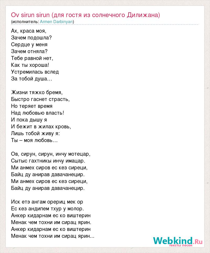 Ах, краса моя, Зачем подошла? Сердце у меня Зачем отняла? Тебе равной нет, Как ты хороша! Устремилась вслед За тобой душа… Жизни тяжко бремя, Быстро гаснет страсть, Но теряет время Над любовью власть! И пока дышу я И бежит в жилах кровь, Лишь тобой живу я: Ты – моя любовь… Ов, сирун, сирун, инчу мотецар, Сытыс гахтникы инчу имацар. Ми анмех сиров ес кез сиреци, Байц ду анирав давачанецир. Ми анмех сиров ес кез сиреци, Байц ду анирав давачанецир. Иск етэ ангам орериц мек ор Ес кез андипем тхур у молор. Анкер кидарнам ес ко виштерин Менак чем тохни им сирац ярин. Анкер кидарнам ес ко виштерин Менак чем тохни им сирац ярин...