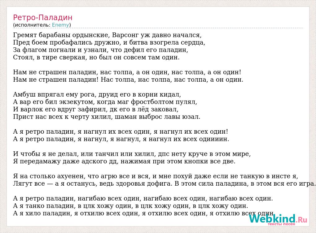Гремят барабаны ордынские, Варсонг уж давно начался, Пред боем пробафались дружно, и битва взогрела сердца, За флагом погнали и узнали, что дефил его паладин, Стоял, в тире сверкая, но был он совсем там один. Нам не страшен паладин, нас толпа, а он один, нас толпа, а он один! Нам не страшен паладин! Нас толпа, нас толпа, нас толпа, а он один. Амбуш впрягал ему рога, друид его в корни кидал, А вар его бил экзекутом, когда маг фростболтом пулял, И варлок его вдруг зафирил, дк его в лёд заковал, Прист нас всех к черту хилил, шаман выброс лавы юзал. А я ретро паладин, я нагнул их всех один, я нагнул их всех один! А я ретро паладин, я нагнул, я нагнул, я нагнул их всех одиииин. И чтобы я не делал, или танчил или хилил, дпс нету круче в этом мире, Я передамажу даже адского дд, нажимая при этом кнопки все две. Я на столько ахуенен, что агрю все и вся, и мне похуй даже если не танкую в инсте я, Лягут все — а я останусь, ведь здоровья дофига. В этом сила паладина, в этом вся его игра. А я ретро паладин, нагибаю всех один, нагибаю всех один, нагибаю всех один. А я танко паладин, в цлк хожу один, в цлк хожу один, в цлк хожу один. А я хило паладин, я отхилю всех один, я отхилю всех один, я отхилю всех один.