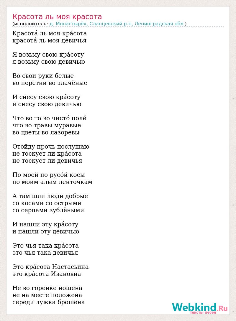 Красота́ ль моя кра́сота красота́ ль моя девичья Я возьму свою кра́соту я возьму свою девичью Во свои руки белые во перстни во злачёные И снесу свою кра́соту и снесу свою девичью Что во то во чисто́ поле́ что во травы муравые во цветы во лазоревы Отойду прочь послушаю не тоскует ли кра́сота не тоскует ли девичья По моей по русо́й косы по моим алым ленточкам А там шли люди добрые со косами со острыми со серпами зублёными И нашли эту кра́соту и нашли эту девичью Это чья така кра́сота это чья така девичья Это кра́сота Настасьина это кра́сота Ивановна Не во горенке ношена не на месте положена середи лужка брошена