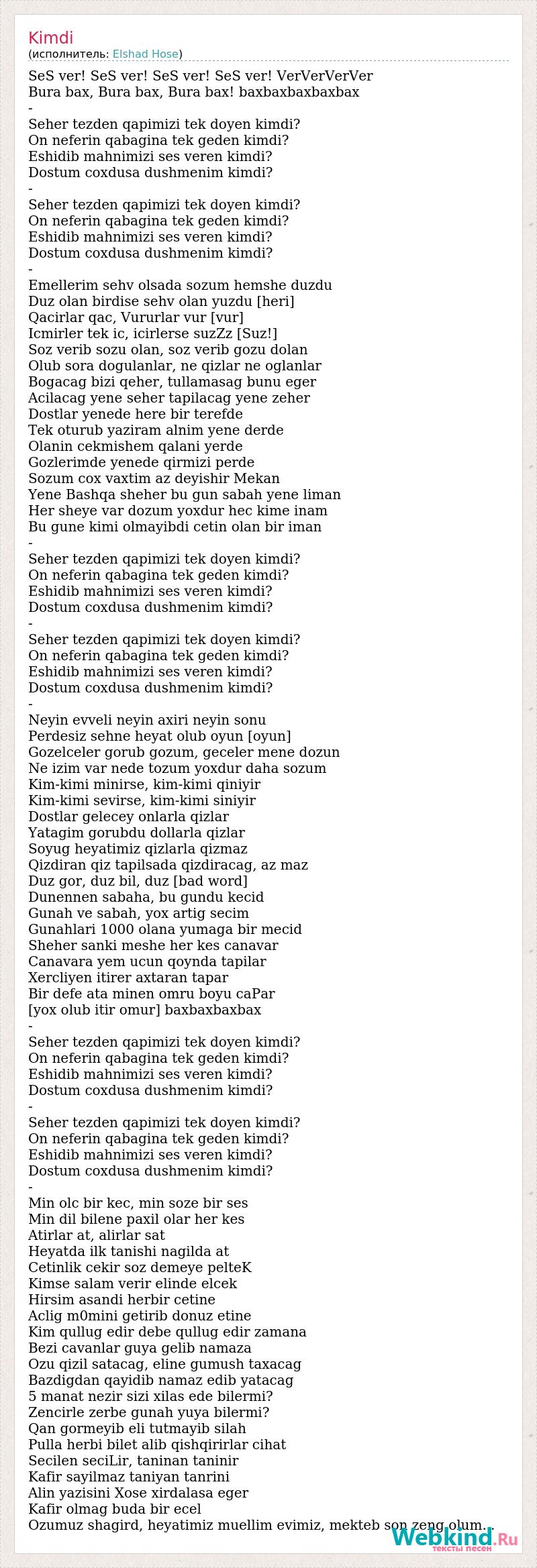 SeS ver! SeS ver! SeS ver! SeS ver! VerVerVerVer Bura bax, Bura bax, Bura bax! baxbaxbaxbaxbax - Seher tezden qapimizi tek doyen kimdi? On neferin qabagina tek geden kimdi? Eshidib mahnimizi ses veren kimdi? Dostum coxdusa dushmenim kimdi? - Seher tezden qapimizi tek doyen kimdi? On neferin qabagina tek geden kimdi? Eshidib mahnimizi ses veren kimdi? Dostum coxdusa dushmenim kimdi? - Emellerim sehv olsada sozum hemshe duzdu Duz olan birdise sehv olan yuzdu [heri] Qacirlar qac, Vururlar vur [vur] Icmirler tek ic, icirlerse suzZz [Suz!] Soz verib sozu olan, soz verib gozu dolan Olub sora dogulanlar, ne qizlar ne oglanlar Bogacag bizi qeher, tullamasag bunu eger Acilacag yene seher tapilacag yene zeher Dostlar yenede here bir terefde Tek oturub yaziram alnim yene derde Olanin cekmishem qalani yerde Gozlerimde yenede qirmizi perde Sozum cox vaxtim az deyishir Mekan Yene Bashqa sheher bu gun sabah yene liman Her sheye var dozum yoxdur hec kime inam Bu gune kimi olmayibdi cetin olan bir iman - Seher tezden qapimizi tek doyen kimdi? On neferin qabagina tek geden kimdi? Eshidib mahnimizi ses veren kimdi? Dostum coxdusa dushmenim kimdi? - Seher tezden qapimizi tek doyen kimdi? On neferin qabagina tek geden kimdi? Eshidib mahnimizi ses veren kimdi? Dostum coxdusa dushmenim kimdi? - Neyin evveli neyin axiri neyin sonu Perdesiz sehne heyat olub oyun [oyun] Gozelceler gorub gozum, geceler mene dozun Ne izim var nede tozum yoxdur daha sozum Kim-kimi minirse, kim-kimi qiniyir Kim-kimi sevirse, kim-kimi siniyir Dostlar gelecey onlarla qizlar Yatagim gorubdu dollarla qizlar Soyug heyatimiz qizlarla qizmaz Qizdiran qiz tapilsada qizdiracag, az maz Duz gor, duz bil, duz [bad word] Dunennen sabaha, bu gundu kecid Gunah ve sabah, yox artig secim Gunahlari 1000 olana yumaga bir mecid Sheher sanki meshe her kes canavar Canavara yem ucun qoynda tapilar Xercliyen itirer axtaran tapar Bir defe ata minen omru boyu caPar [yox olub itir omur] baxbaxbaxbax - Seher tezden qapimizi tek doyen kimdi? On neferin qabagina tek geden kimdi? Eshidib mahnimizi ses veren kimdi? Dostum coxdusa dushmenim kimdi? - Seher tezden qapimizi tek doyen kimdi? On neferin qabagina tek geden kimdi? Eshidib mahnimizi ses veren kimdi? Dostum coxdusa dushmenim kimdi? - Min olc bir kec, min soze bir ses Min dil bilene paxil olar her kes Atirlar at, alirlar sat Heyatda ilk tanishi nagilda at Cetinlik cekir soz demeye pelteK Kimse salam verir elinde elcek Hirsim asandi herbir cetine Aclig m0mini getirib donuz etine Kim qullug edir debe qullug edir zamana Bezi cavanlar guya gelib namaza Ozu qizil satacag, eline gumush taxacag Bazdigdan qayidib namaz edib yatacag 5 manat nezir sizi xilas ede bilermi? Zencirle zerbe gunah yuya bilermi? Qan gormeyib eli tutmayib silah Pulla herbi bilet alib qishqirirlar cihat Secilen seciLir, taninan taninir Kafir sayilmaz taniyan tanrini Alin yazisini Xose xirdalasa eger Kafir olmag buda bir ecel Ozumuz shagird, heyatimiz muellim evimiz, mekteb son zeng olum...