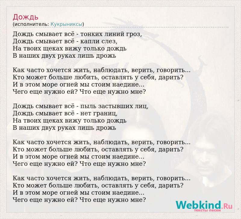 Дождь смывает всё - тонких линий гроз, Дождь смывает всё - капли слез, На твоих щеках вижу только дождь В наших двух руках лишь дрожь Как часто хочется жить, наблюдать, верить, говорить... Кто может больше любить, оставлять у себя, дарить? И в этом море огней мы стоим наедине... Чего еще нужно ей? Что еще нужно мне? Дождь смывает всё - пыль застывших лиц, Дождь смывает всё - нет границ, На твоих щеках вижу только дождь В наших двух руках лишь дрожь Как часто хочется жить, наблюдать, верить, говорить... Кто может больше любить, оставлять у себя, дарить? И в этом море огней мы стоим наедине... Чего еще нужно ей? Что еще нужно мне? Как часто хочется жить, наблюдать, верить, говорить... Кто может больше любить, оставлять у себя, дарить? И в этом море огней мы стоим наедине... Чего еще нужно ей? Что еще нужно мне?