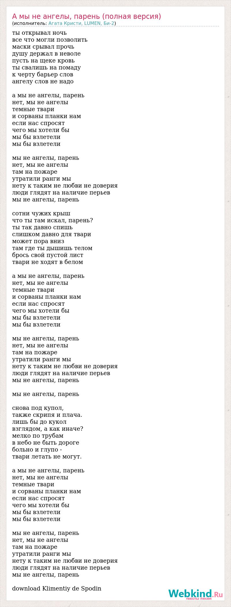 ты открывал ночь все что могли позволить маски срывал прочь душу держал в неволе пусть на щеке кровь ты свалишь на помаду к черту барьер слов ангелу слов не надо а мы не ангелы, парень нет, мы не ангелы темные твари и сорваны планки нам если нас спросят чего мы хотели бы мы бы взлетели мы бы взлетели мы не ангелы, парень нет, мы не ангелы там на пожаре утратили ранги мы нету к таким не любви не доверия люди глядят на наличие перьев мы не ангелы, парень сотни чужих крыш что ты там искал, парень? ты так давно спишь слишком давно для твари может пора вниз там где ты дышишь телом брось свой пустой лист твари не ходят в белом а мы не ангелы, парень нет, мы не ангелы темные твари и сорваны планки нам если нас спросят чего мы хотели бы мы бы взлетели мы бы взлетели мы не ангелы, парень нет, мы не ангелы там на пожаре утратили ранги мы нету к таким не любви не доверия люди глядят на наличие перьев мы не ангелы, парень мы не ангелы, парень снова под купол, также скрипя и плача. лишь бы до кукол взглядом, а как иначе? мелко по трубам в небо не быть дороге больно и глупо - твари летать не могут. а мы не ангелы, парень нет, мы не ангелы темные твари и сорваны планки нам если нас спросят чего мы хотели бы мы бы взлетели мы бы взлетели мы не ангелы, парень нет, мы не ангелы там на пожаре утратили ранги мы нету к таким не любви не доверия люди глядят на наличие перьев мы не ангелы, парень download Klimentiy de Spodin