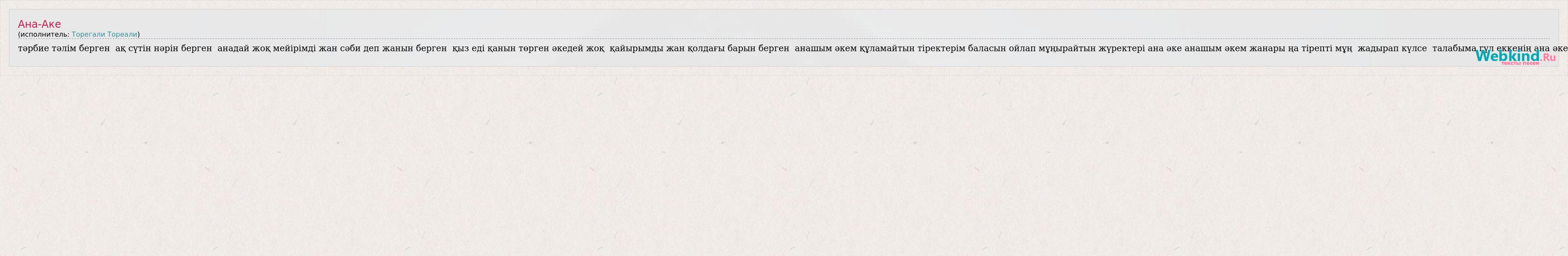 тәрбие тәлім берген ақ сүтін нәрін берген анадай жоқ мейірімді жан сәби деп жанын берген қыз еді қанын төрген әкедей жоқ қайырымды жан қолдағы барын берген анашым әкем құламайтын тіректерім баласын ойлап мұңырайтын жүректері ана әке анашым әкем жанары ңа тірепті мұң жадырап күлсе талабыма гүл еккенің ана әке