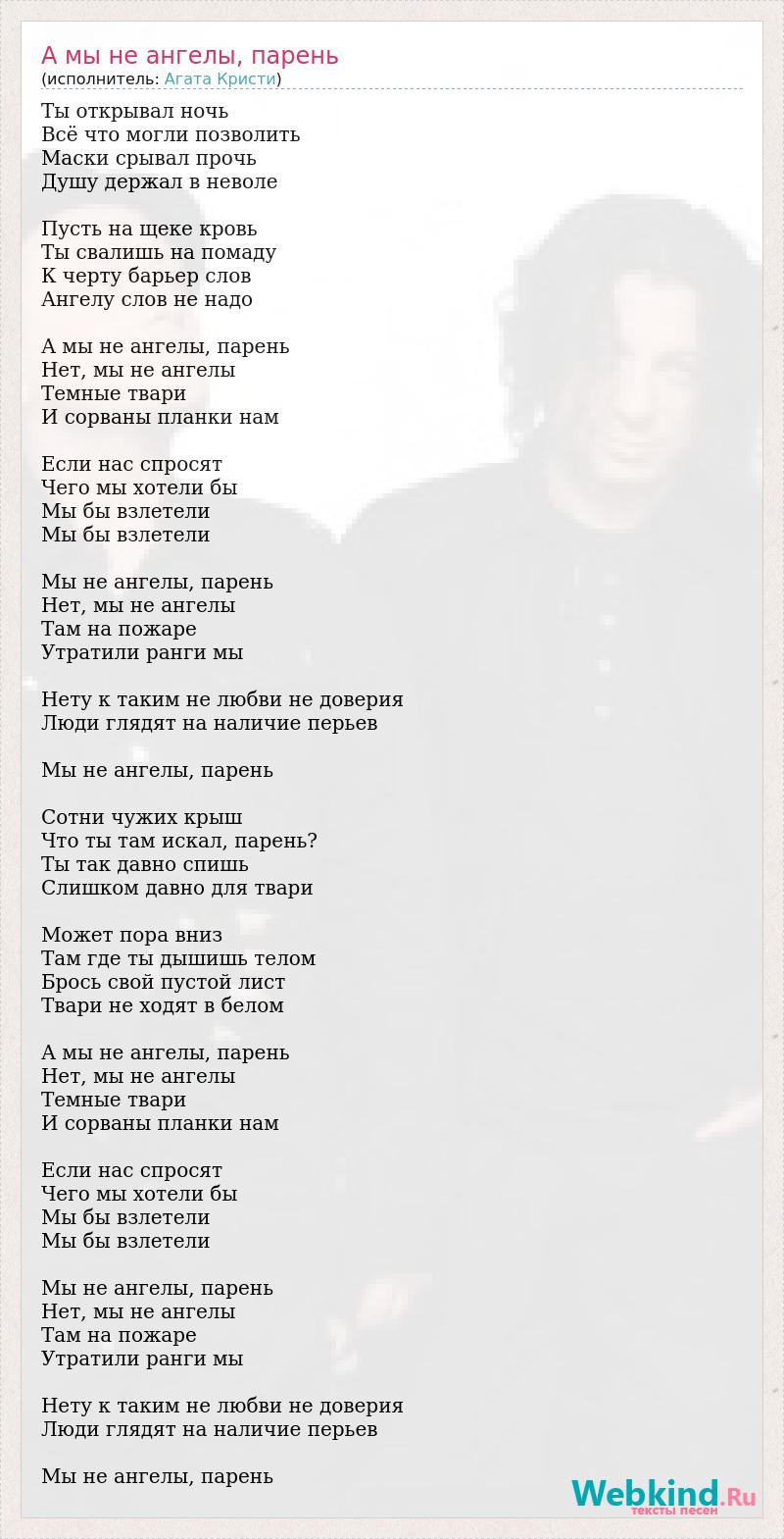 Ты открывал ночь Всё что могли позволить Маски срывал прочь Душу держал в неволе Пусть на щеке кровь Ты свалишь на помаду К черту барьер слов Ангелу слов не надо А мы не ангелы, парень Нет, мы не ангелы Темные твари И сорваны планки нам Если нас спросят Чего мы хотели бы Мы бы взлетели Мы бы взлетели Мы не ангелы, парень Нет, мы не ангелы Там на пожаре Утратили ранги мы Нету к таким не любви не доверия Люди глядят на наличие перьев Мы не ангелы, парень Сотни чужих крыш Что ты там искал, парень? Ты так давно спишь Слишком давно для твари Может пора вниз Там где ты дышишь телом Брось свой пустой лист Твари не ходят в белом А мы не ангелы, парень Нет, мы не ангелы Темные твари И сорваны планки нам Если нас спросят Чего мы хотели бы Мы бы взлетели Мы бы взлетели Мы не ангелы, парень Нет, мы не ангелы Там на пожаре Утратили ранги мы Нету к таким не любви не доверия Люди глядят на наличие перьев Мы не ангелы, парень