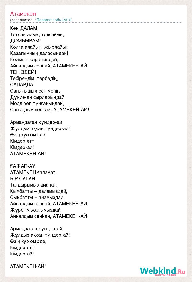 Кең ДАЛАМ! Толған айым, толғайын, ДОМБЫРАМ! Қолға алайын, жырлайын, Қазағымның даласындай! Көзімнің қарасындай, Айналдым сені-ай, АТАМЕКЕН-АЙ! ТЕҢІЗДЕЙ! Тебірендім, тербедің, САПАРДА! Сағынышым сен менің, Дүние-ай сырларындай, Мөлдіреп тұнғанындай, Сағындым сені-ай, АТАМЕКЕН-АЙ! Армандаған күндер-ай! Жұлдыз аққан түндер-ай! Өзің куә өмірде, Кімдер өтті, Кімдер-ай! АТАМЕКЕН-АЙ! ҒАЖАП-АУ! АТАМЕКЕН ғаламат, БІР САҒАН! Тағдырымыз аманат, Қымбатты – даламыздай, Сымбатты – анамыздай, Айналдым сені-ай, АТАМЕКЕН-АЙ! Жүрегім жанымыздай, Айналдым сені-ай, АТАМЕКЕН-АЙ! Армандаған күндер-ай! Жұлдыз аққан түндер-ай! Өзің куә өмірде, Кімдер өтті, Кімдер-ай! АТАМЕКЕН-АЙ!
