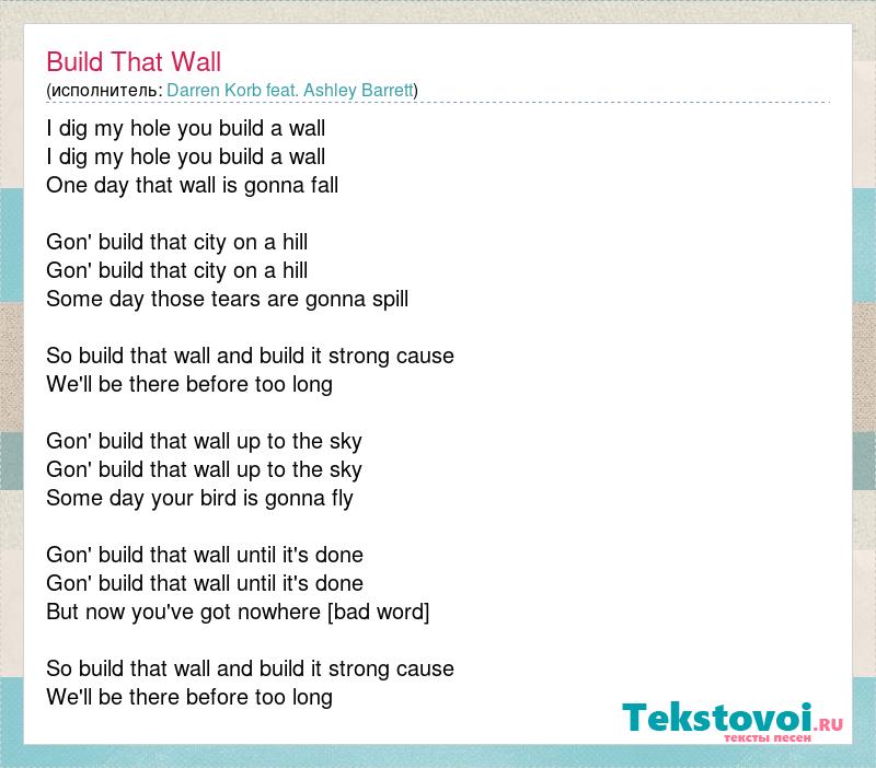 I dig my hole you build a wall I dig my hole you build a wall One day that wall is gonna fall Gon' build that city on a hill Gon' build that city on a hill Some day those tears are gonna spill So build that wall and build it strong cause We'll be there before too long Gon' build that wall up to the sky Gon' build that wall up to the sky Some day your bird is gonna fly Gon' build that wall until it's done Gon' build that wall until it's done But now you've got nowhere [bad word] So build that wall and build it strong cause We'll be there before too long