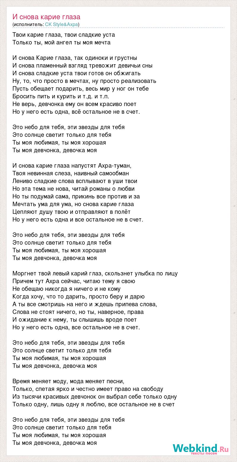 Твои карие глаза, твои сладкие уста Только ты, мой ангел ты моя мечта И снова Карие глаза, так одиноки и грустны И снова пламенный взгляд тревожит девичьи сны И снова сладкие уста твои готов он обжигать Ну, то, что просто в мечтах, ну просто реализовать Пусть обещает подарить, весь мир у ног он тебе Бросить пить и курить и т.д. и т.п. Не верь, девчонка ему он всем красиво поет Но у него есть одна, всё остальное не в счет. Это небо для тебя, эти звезды для тебя Это солнце светит только для тебя Ты моя любимая, ты моя хорошая Ты моя девчонка, девочка моя И снова карие глаза напустят Ахра-туман, Твоя невинная слеза, наивный самообман Лениво сладкие слова всплывают в уши твои Но эта тема не нова, читай романы о любви Но ты подумай сама, прикинь все против и за Мечтать ума для ума, но снова карие глаза Цепляют душу твою и отправляют в полёт Но у него есть одна и все остальное не в счет. Это небо для тебя, эти звезды для тебя Это солнце светит только для тебя Ты моя любимая, ты моя хорошая Ты моя девчонка, девочка моя Моргнет твой левый карий глаз, скользнет улыбка по лицу Причем тут Ахра сейчас, читаю тему я свою Не обещаю никогда я ничего и не кому Когда хочу, что то дарить, просто беру и дарю А ты все смотришь на него и ждешь припева слова, Слова не стоят ничего, но ты, наверное, права И ожидание к нему, ты слышишь вроде поет Но у него есть одна, все остальное не в счет. Это небо для тебя, эти звезды для тебя Это солнце светит только для тебя Ты моя любимая, ты моя хорошая Ты моя девчонка, девочка моя Время меняет моду, мода меняет песни, Только, спетая ярко и честно имеет право на свободу Из тысячи красивых девчонок он выбрал себе только одну Только одну, лишь одну я люблю, все остальное не в счет Это небо для тебя, эти звезды для тебя Это солнце светит только для тебя Ты моя любимая, ты моя хорошая Ты моя девчонка, девочка моя