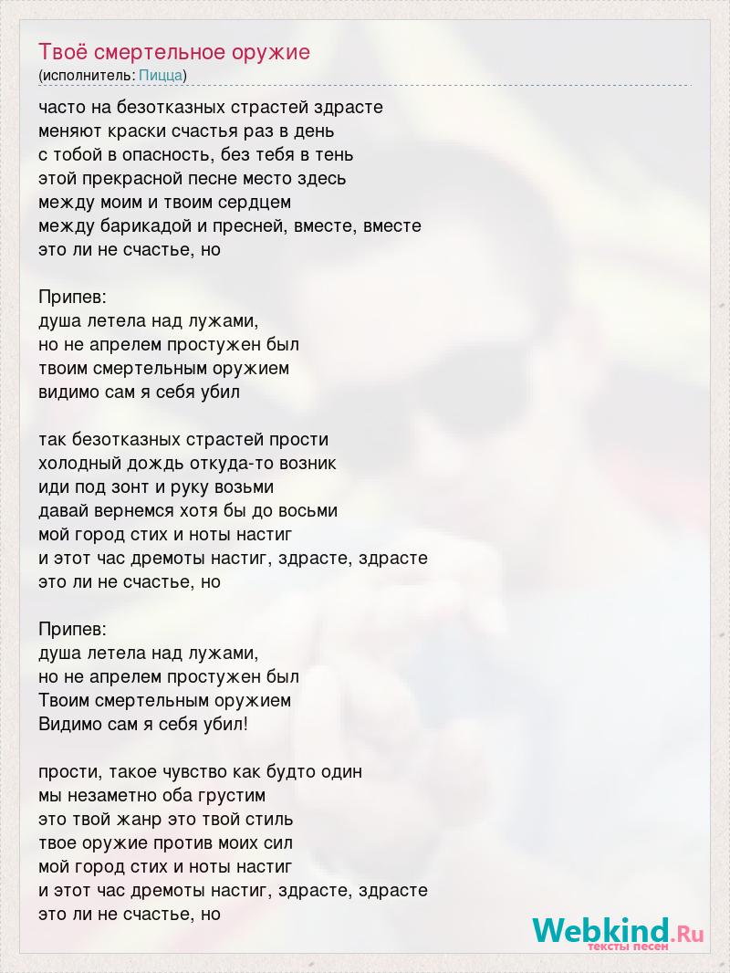 часто на безотказных страстей здрасте меняют краски счастья раз в день с тобой в опасность, без тебя в тень этой прекрасной песне место здесь между моим и твоим сердцем между барикадой и пресней, вместе, вместе это ли не счастье, но Припев: душа летела над лужами, но не апрелем простужен был твоим смертельным оружием видимо сам я себя убил так безотказных страстей прости холодный дождь откуда-то возник иди под зонт и руку возьми давай вернемся хотя бы до восьми мой город стих и ноты настиг и этот час дремоты настиг, здрасте, здрасте это ли не счастье, но Припев: душа летела над лужами, но не апрелем простужен был Твоим смертельным оружием Видимо сам я себя убил! прости, такое чувство как будто один мы незаметно оба грустим это твой жанр это твой стиль твое оружие против моих сил мой город стих и ноты настиг и этот час дремоты настиг, здрасте, здрасте это ли не счастье, но