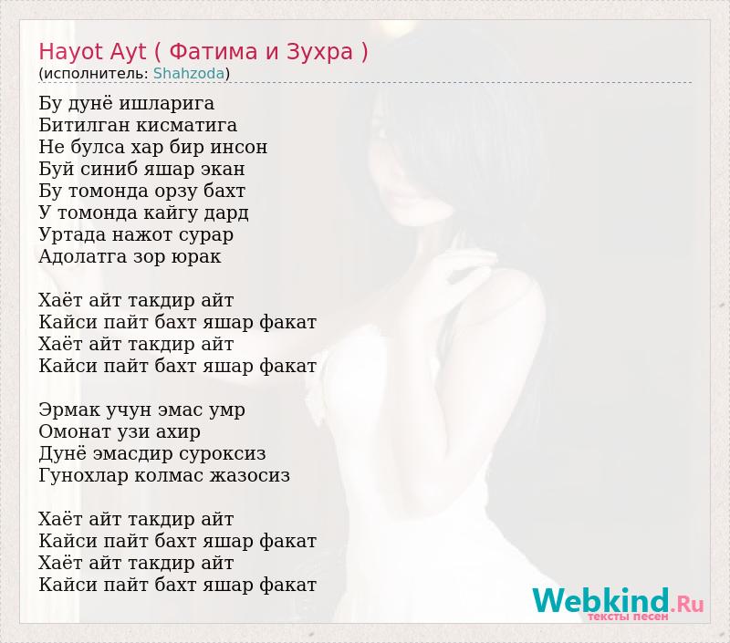 А как ты думаешь, о чем песня "Hayot Ayt ( Фатима и Зухра )" ?