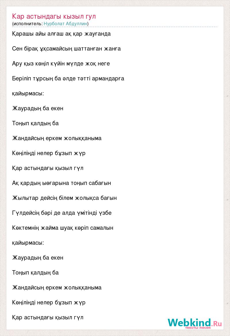 Қарашы айы алғаш ақ қар жауғанда Сен бірақ ұқсамайсың шаттанған жанға Ару қыз көңіл күйін мүлде жоқ неге Беріліп тұрсың ба әлде тәтті армандарға қайырмасы: Жаурадың ба екен Тоңып қалдың ба Жандайсың еркем жолыққаныма Көңіліңді нелер бұзып жүр Қар астындағы қызыл гүл Ақ қардың ыөғарына тоңып сабағын Жылытар дейсің білем жолықса бағын Гүлдейсің бәрі де алда үмітінді үзбе Көктемнің жайма шуақ көріп самалын қайырмасы: Жаурадың ба екен Тоңып қалдың ба Жандайсың еркем жолыққаныма Көңіліңді нелер бұзып жүр Қар астындағы қызыл гүл