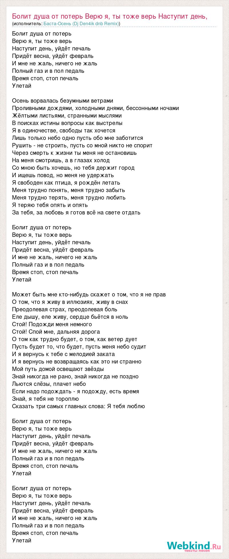 Болит душа от потерь Верю я, ты тоже верь Наступит день, уйдёт печаль Придёт весна, уйдёт февраль И мне не жаль, ничего не жаль Полный газ и в пол педаль Время стоп, стоп печаль Улетай Осень ворвалась безумными ветрами Проливными дождями, холодными днями, бессонными ночами Жёлтыми листьями, странными мыслями В поисках истины вопросы как выстрелы Я в одиночестве, свободы так хочется Лишь только небо одно пусть обо мне заботится Рушить - не строить, пусть со мной никто не спорит Через смерть к жизни ты меня не остановишь На меня смотришь, а в глазах холод Со мною быть хочешь, но тебя держит город И ищешь повод, но меня не удержать Я свободен как птица, я рождён летать Меня трудно понять, меня трудно забыть Меня трудно терять, меня трудно любить Я теряю тебя опять и опять За тебя, за любовь я готов всё на свете отдать Болит душа от потерь Верю я, ты тоже верь Наступит день, уйдёт печаль Придёт весна, уйдёт февраль И мне не жаль, ничего не жаль Полный газ и в пол педаль Время стоп, стоп печаль Улетай Может быть мне кто-нибудь скажет о том, что я не прав О том, что я живу в иллюзиях, живу в снах Преодолевая страх, преодолевая боль Еле дышу, еле живу, сердце бьётся в ноль Стой! Подожди меня немного Стой! Спой мне, дальняя дорога О том как трудно будет, о том, как ветер дует Пусть будет то, что будет, пусть меня небо судит И я вернусь к тебе с мелодией заката И я вернусь не возвращаясь как это ни странно Мой путь домой освещают звёзды Знай никогда не рано, знай никогда не поздно Льются слёзы, плачет небо Если надо подождать - я подожду, есть время Знай, я тебя не тороплю Сказать три самых главных слова: Я тебя люблю Болит душа от потерь Верю я, ты тоже верь Наступит день, уйдёт печаль Придёт весна, уйдёт февраль И мне не жаль, ничего не жаль Полный газ и в пол педаль Время стоп, стоп печаль Улетай Болит душа от потерь Верю я, ты тоже верь Наступит день, уйдёт печаль Придёт весна, уйдёт февраль И мне не жаль, ничего не жаль Полный газ и в пол педаль Время стоп, стоп печаль Улетай