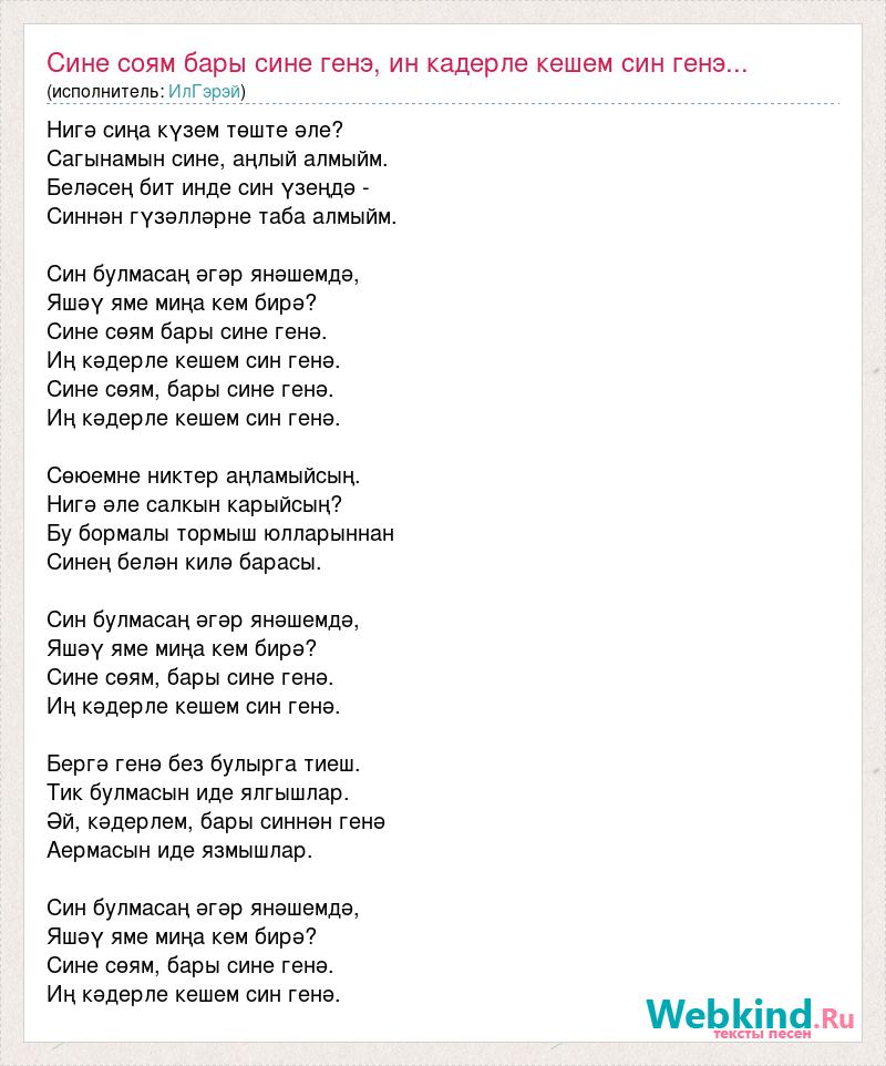 Нигә сиңа күзем төште әле? Сагынамын сине, аңлый алмыйм. Беләсең бит инде син үзеңдә - Синнән гүзәлләрне таба алмыйм. Син булмасаң әгәр янәшемдә, Яшәү яме миңа кем бирә? Сине сөям бары сине генә. Иң кәдерле кешем син генә. Сине сөям, бары сине генә. Иң кәдерле кешем син генә. Сөюемне никтер аңламыйсың. Нигә әле салкын карыйсың? Бу бормалы тормыш юлларыннан Синең белән килә барасы. Син булмасаң әгәр янәшемдә, Яшәү яме миңа кем бирә? Сине сөям, бары сине генә. Иң кәдерле кешем син генә. Бергә генә без булырга тиеш. Тик булмасын иде ялгышлар. Әй, кәдерлем, бары синнән генә Аермасын иде язмышлар. Син булмасаң әгәр янәшемдә, Яшәү яме миңа кем бирә? Сине сөям, бары сине генә. Иң кәдерле кешем син генә.