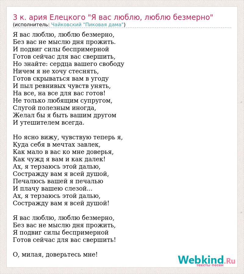 Я вас люблю, люблю безмерно, Без вас не мыслю дня прожить. И подвиг силы беспримерной Готов сейчас для вас свершить, Но знайте: сердца вашего свободу Ничем я не хочу стеснять, Готов скрываться вам в угоду И пыл ревнивых чувств унять, На все, на все для вас готов! Не только любящим супругом, Слугой полезным иногда, Желал бы я быть вашим другом И утешителем всегда. Но ясно вижу, чувствую теперь я, Куда себя в мечтах завлек, Как мало в вас ко мне доверья, Как чужд я вам и как далек! Ах, я терзаюсь этой далью, Состражду вам я всей душой, Печалюсь вашей я печалью И плачу вашею слезой... Ах, я терзаюсь этой далью, Состражду вам я всей душой! Я вас люблю, люблю безмерно, Без вас не мыслю дня прожить, Я подвиг силы беспримерной Готов сейчас для вас свершить! О, милая, доверьтесь мне!
