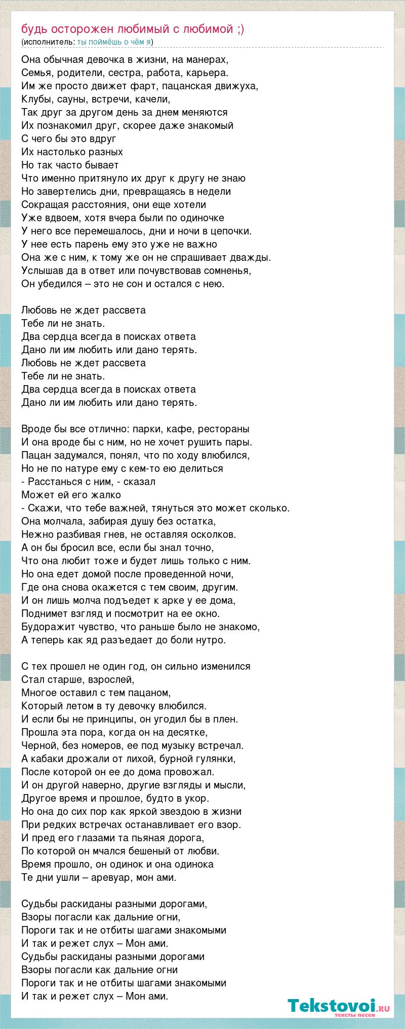 Она обычная девочка в жизни, на манерах, Семья, родители, сестра, работа, карьера. Им же просто движет фарт, пацанская движуха, Клубы, сауны, встречи, качели, Так друг за другом день за днем меняются Их познакомил друг, скорее даже знакомый С чего бы это вдруг Их настолько разных Но так часто бывает Что именно притянуло их друг к другу не знаю Но завертелись дни, превращаясь в недели Сокращая расстояния, они еще хотели Уже вдвоем, хотя вчера были по одиночке У него все перемешалось, дни и ночи в цепочки. У нее есть парень ему это уже не важно Она же с ним, к тому же он не спрашивает дважды. Услышав да в ответ или почувствовав сомненья, Он убедился – это не сон и остался с нею. Любовь не ждет рассвета Тебе ли не знать. Два сердца всегда в поисках ответа Дано ли им любить или дано терять. Любовь не ждет рассвета Тебе ли не знать. Два сердца всегда в поисках ответа Дано ли им любить или дано терять. Вроде бы все отлично: парки, кафе, рестораны И она вроде бы с ним, но не хочет рушить пары. Пацан задумался, понял, что по ходу влюбился, Но не по натуре ему с кем-то ею делиться - Расстанься с ним, - сказал Может ей его жалко - Скажи, что тебе важней, тянуться это может сколько. Она молчала, забирая душу без остатка, Нежно разбивая гнев, не оставляя осколков. А он бы бросил все, если бы знал точно, Что она любит тоже и будет лишь только с ним. Но она едет домой после проведенной ночи, Где она снова окажется с тем своим, другим. И он лишь молча подъедет к арке у ее дома, Поднимет взгляд и посмотрит на ее окно. Будоражит чувство, что раньше было не знакомо, А теперь как яд разъедает до боли нутро. С тех прошел не один год, он сильно изменился Стал старше, взрослей, Многое оставил с тем пацаном, Который летом в ту девочку влюбился. И если бы не принципы, он угодил бы в плен. Прошла эта пора, когда он на десятке, Черной, без номеров, ее под музыку встречал. А кабаки дрожали от лихой, бурной гулянки, После которой он ее до дома провожал. И он другой наверно, другие взгляды и мысли, Другое время и прошлое, будто в укор. Но она до сих пор как яркой звездою в жизни При редких встречах останавливает его взор. И пред его глазами та пьяная дорога, По которой он мчался бешеный от любви. Время прошло, он одинок и она одинока Те дни ушли – аревуар, мон ами. Судьбы раскиданы разными дорогами, Взоры погасли как дальние огни, Пороги так и не отбиты шагами знакомыми И так и режет слух – Мон ами. Судьбы раскиданы разными дорогами Взоры погасли как дальние огни Пороги так и не отбиты шагами знакомыми И так и режет слух – Мон ами.