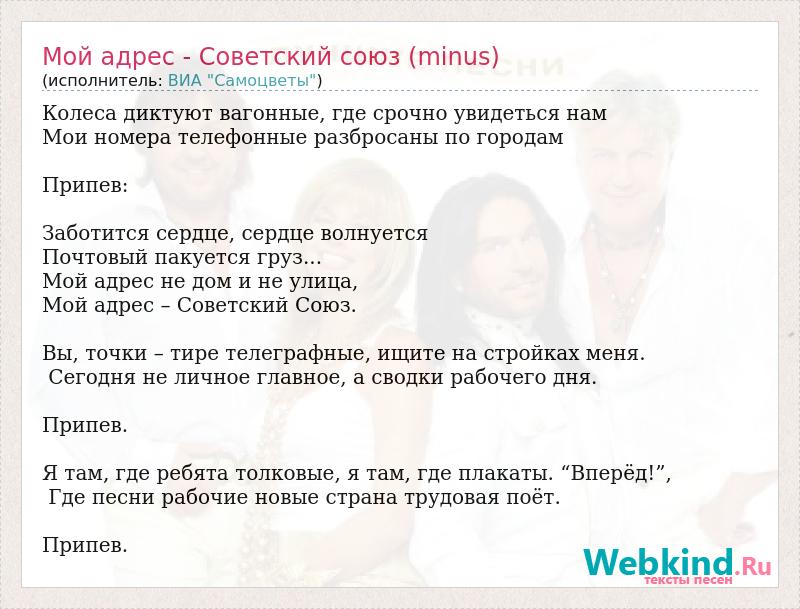 Колеса диктуют вагонные, где срочно увидеться нам Мои номера телефонные разбросаны по городам Припев: Заботится сердце, сердце волнуется Почтовый пакуется груз... Мой адрес не дом и не улица, Мой адрес – Советский Союз. Вы, точки – тире телеграфные, ищите на стройках меня. Сегодня не личное главное, а сводки рабочего дня. Припев. Я там, где ребята толковые, я там, где плакаты. “Вперёд!”, Где песни рабочие новые страна трудовая поёт. Припев.