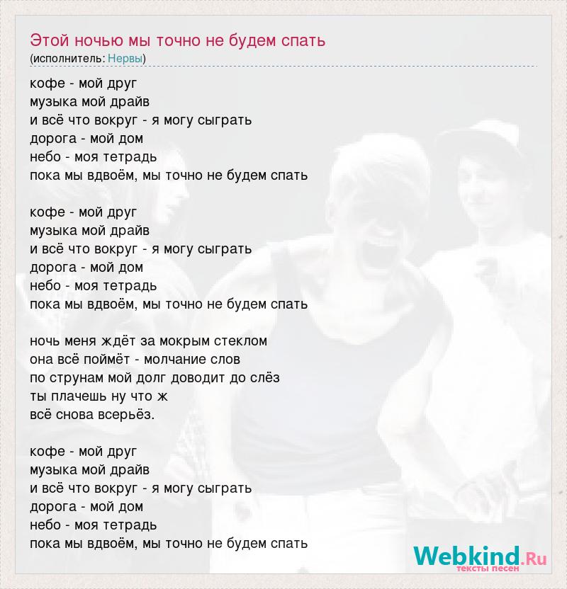 кофе - мой друг музыка мой драйв и всё что вокруг - я могу сыграть дорога - мой дом небо - моя тетрадь пока мы вдвоём, мы точно не будем спать кофе - мой друг музыка мой драйв и всё что вокруг - я могу сыграть дорога - мой дом небо - моя тетрадь пока мы вдвоём, мы точно не будем спать ночь меня ждёт за мокрым стеклом она всё поймёт - молчание слов по струнам мой долг доводит до слёз ты плачешь ну что ж всё снова всерьёз. кофе - мой друг музыка мой драйв и всё что вокруг - я могу сыграть дорога - мой дом небо - моя тетрадь пока мы вдвоём, мы точно не будем спать