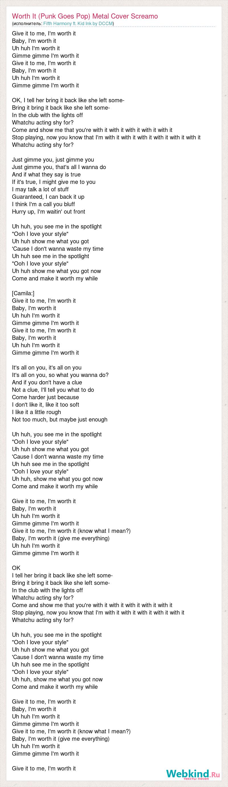 Give it to me, I'm worth it Baby, I'm worth it Uh huh I'm worth it Gimme gimme I'm worth it Give it to me, I'm worth it Baby, I'm worth it Uh huh I'm worth it Gimme gimme I'm worth it OK, I tell her bring it back like she left some- Bring it bring it back like she left some- In the club with the lights off Whatchu acting shy for? Come and show me that you're with it with it with it with it with it Stop playing, now you know that I'm with it with it with it with it with it with it Whatchu acting shy for? Just gimme you, just gimme you Just gimme you, that's all I wanna do And if what they say is true If it's true, I might give me to you I may talk a lot of stuff Guaranteed, I can back it up I think I'm a call you bluff Hurry up, I'm waitin' out front Uh huh, you see me in the spotlight "Ooh I love your style" Uh huh show me what you got 'Cause I don't wanna waste my time Uh huh see me in the spotlight "Ooh I love your style" Uh huh show me what you got now Come and make it worth my while [Camila:] Give it to me, I'm worth it Baby, I'm worth it Uh huh I'm worth it Gimme gimme I'm worth it Give it to me, I'm worth it Baby, I'm worth it Uh huh I'm worth it Gimme gimme I'm worth it It's all on you, it's all on you It's all on you, so what you wanna do? And if you don't have a clue Not a clue, I'll tell you what to do Come harder just because I don't like it, like it too soft I like it a little rough Not too much, but maybe just enough Uh huh, you see me in the spotlight "Ooh I love your style" Uh huh show me what you got 'Cause I don't wanna waste my time Uh huh see me in the spotlight "Ooh I love your style" Uh huh, show me what you got now Come and make it worth my while Give it to me, I'm worth it Baby, I'm worth it Uh huh I'm worth it Gimme gimme I'm worth it Give it to me, I'm worth it (know what I mean?) Baby, I'm worth it (give me everything) Uh huh I'm worth it Gimme gimme I'm worth it OK I tell her bring it back like she left some- Bring it bring it back like she left some- In the club with the lights off Whatchu acting shy for? Come and show me that you're with it with it with it with it with it Stop playing, now you know that I'm with it with it with it with it with it Whatchu acting shy for? Uh huh, you see me in the spotlight "Ooh I love your style" Uh huh show me what you got 'Cause I don't wanna waste my time Uh huh see me in the spotlight "Ooh I love your style" Uh huh, show me what you got now Come and make it worth my while Give it to me, I'm worth it Baby, I'm worth it Uh huh I'm worth it Gimme gimme I'm worth it Give it to me, I'm worth it (know what I mean?) Baby, I'm worth it (give me everything) Uh huh I'm worth it Gimme gimme I'm worth it Give it to me, I'm worth it