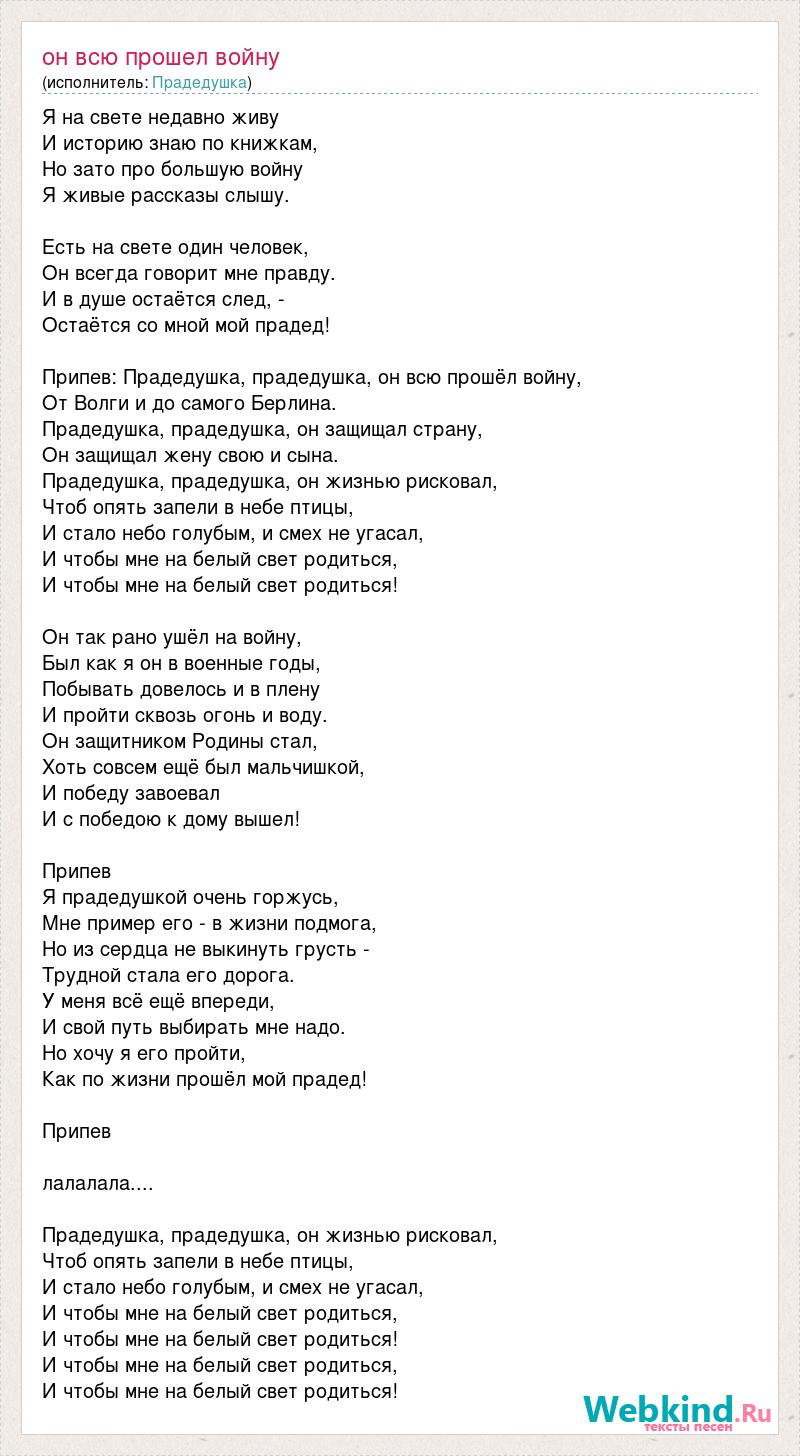 Я на свете недавно живу И историю знаю по книжкам, Но зато про большую войну Я живые рассказы слышу. Есть на свете один человек, Он всегда говорит мне правду. И в душе остаётся след, - Остаётся со мной мой прадед! Припев: Прадедушка, прадедушка, он всю прошёл войну, От Волги и до самого Берлина. Прадедушка, прадедушка, он защищал страну, Он защищал жену свою и сына. Прадедушка, прадедушка, он жизнью рисковал, Чтоб опять запели в небе птицы, И стало небо голубым, и смех не угасал, И чтобы мне на белый свет родиться, И чтобы мне на белый свет родиться! Он так рано ушёл на войну, Был как я он в военные годы, Побывать довелось и в плену И пройти сквозь огонь и воду. Он защитником Родины стал, Хоть совсем ещё был мальчишкой, И победу завоевал И с победою к дому вышел! Припев Я прадедушкой очень горжусь, Мне пример его - в жизни подмога, Но из сердца не выкинуть грусть - Трудной стала его дорога. У меня всё ещё впереди, И свой путь выбирать мне надо. Но хочу я его пройти, Как по жизни прошёл мой прадед! Припев лалалала.... Прадедушка, прадедушка, он жизнью рисковал, Чтоб опять запели в небе птицы, И стало небо голубым, и смех не угасал, И чтобы мне на белый свет родиться, И чтобы мне на белый свет родиться! И чтобы мне на белый свет родиться, И чтобы мне на белый свет родиться!