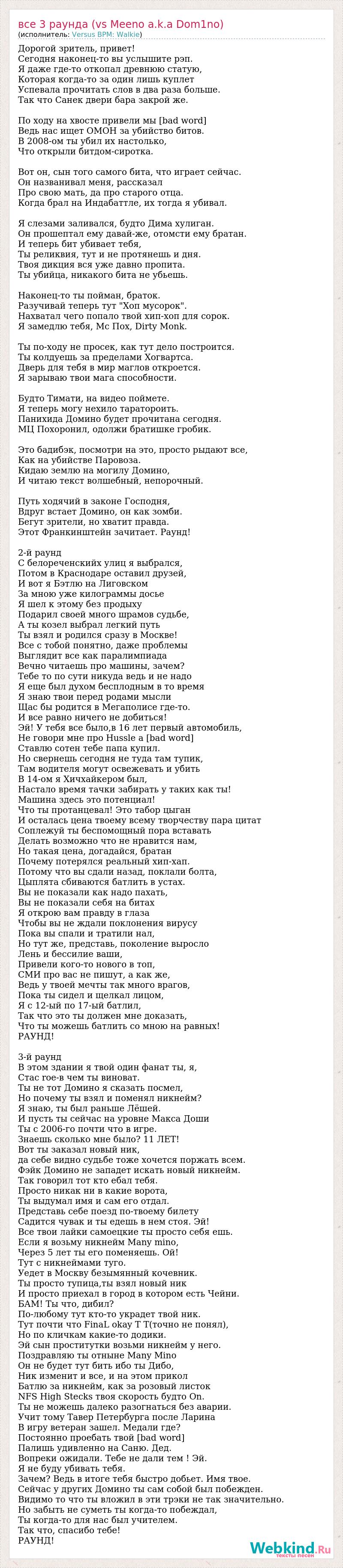 Дорогой зритель, привет! Сегодня наконец-то вы услышите рэп. Я даже где-то откопал древнюю статую, Которая когда-то за один лишь куплет Успевала прочитать слов в два раза больше. Так что Санек двери бара закрой же. По ходу на хвосте привели мы [bad word] Ведь нас ищет ОМОН за убийство битов. В 2008-ом ты убил их настолько, Что открыли битдом-сиротка. Вот он, сын того самого бита, что играет сейчас. Он названивал меня, рассказал Про свою мать, да про старого отца. Когда брал на Индабаттле, их тогда я убивал. Я слезами заливался, будто Дима хулиган. Он прошептал ему давай-же, отомсти ему братан. И теперь бит убивает тебя, Ты реликвия, тут и не протянешь и дня. Твоя дикция вся уже давно пропита. Ты убийца, никакого бита не убьешь. Наконец-то ты пойман, браток. Разучивай теперь тут "Хоп мусорок". Нахватал чего попало твой хип-хоп для сорок. Я замедлю тебя, Mc Пох, Dirty Monk. Ты по-ходу не просек, как тут дело построится. Ты колдуешь за пределами Хогвартса. Дверь для тебя в мир маглов откроется. Я зарываю твои мага способности. Будто Тимати, на видео поймете. Я теперь могу нехило таратороить. Панихида Домино будет прочитана сегодня. МЦ Похоронил, одолжи братишке гробик. Это бадибэк, посмотри на это, просто рыдают все, Как на убийстве Паровоза. Кидаю землю на могилу Домино, И читаю текст волшебный, непорочный. Путь ходячий в законе Господня, Вдруг встает Домино, он как зомби. Бегут зрители, но хватит правда. Этот Франкинштейн зачитает. Раунд! 2-й раунд С белореченскийх улиц я выбрался, Потом в Краснодаре оставил друзей, И вот я Бэтлю на Лиговском За мною уже килограммы досье Я шел к этому без продыху Подарил своей много шрамов судьбе, А ты козел выбрал легкий путь Ты взял и родился сразу в Москве! Все с тобой понятно, даже проблемы Выглядит все как паралимпиада Вечно читаешь про машины, зачем? Тебе то по сути никуда ведь и не надо Я еще был духом бесплодным в то время Я знаю твои перед родами мысли Щас бы родится в Мегаполисе где-то. И все равно ничего не добиться! Эй! У тебя все было,в 16 лет первый автомобиль, Не говори мне про Hussle a [bad word] Ставлю сотен тебе папа купил. Но свернешь сегодня не туда там тупик, Там водителя могут освежевать и убить В 14-ом я Хичхайкером был, Настало время тачки забирать у таких как ты! Машина здесь это потенциал! Что ты протанцевал! Это табор цыган И осталась цена твоему всему творчеству пара цитат Соплежуй ты беспомощный пора вставать Делать возможно что не нравится нам, Но такая цена, догадайся, братан Почему потерялся реальный хип-хап. Потому что вы сдали назад, поклали болта, Цыплята сбиваются батлить в устах. Вы не показали как надо пахать, Вы не показали себя на битах Я открою вам правду в глаза Чтобы вы не ждали поклонения вирусу Пока вы спали и тратили нал, Но тут же, представь, поколение выросло Лень и бессилие ваши, Привели кого-то нового в топ, СМИ про вас не пишут, а как же, Ведь у твоей мечты так много врагов, Пока ты сидел и щелкал лицом, Я с 12-ый по 17-ый батлил, Так что это ты должен мне доказать, Что ты можешь батлить со мною на равных! РАУНД! 3-й раунд В этом здании я твой один фанат ты, я, Стас rое-в чем ты виноват. Ты не тот Домино я сказать посмел, Но почему ты взял и поменял никнейм? Я знаю, ты был раньше Лёшей. И пусть ты сейчас на уровне Макса Доши Ты с 2006-го почти что в игре. Знаешь сколько мне было? 11 ЛЕТ! Вот ты заказал новый ник, да себе видно судьбе тоже хо