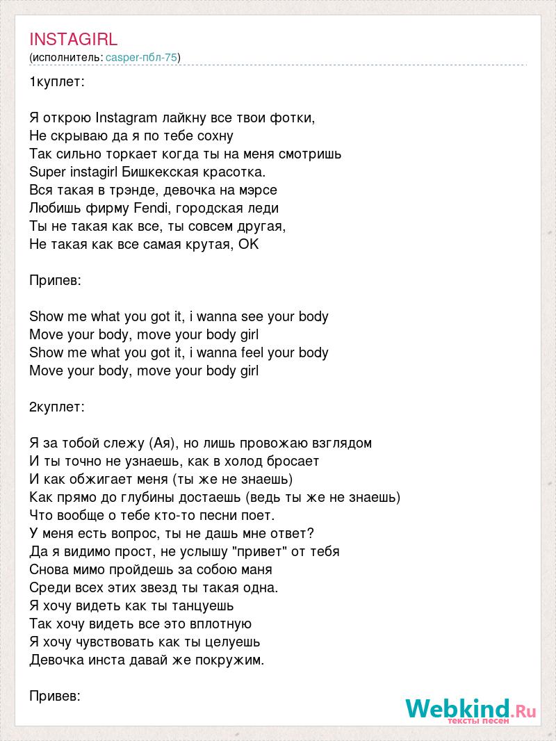 1куплет: Я открою Instagram лайкну все твои фотки, Не скрываю да я по тебе сохну Так сильно торкает когда ты на меня смотришь Super instagirl Бишкекская красотка. Вся такая в трэнде, девочка на мэрсе Любишь фирму Fendi, городская леди Ты не такая как все, ты совсем другая, Не такая как все самая крутая, OK Припев: Show me what you got it, i wanna see your body Move your body, move your body girl Show me what you got it, i wanna feel your body Move your body, move your body girl 2куплет: Я за тобой слежу (Ая), но лишь провожаю взглядом И ты точно не узнаешь, как в холод бросает И как обжигает меня (ты же не знаешь) Как прямо до глубины достаешь (ведь ты же не знаешь) Что вообще о тебе кто-то песни поет. У меня есть вопрос, ты не дашь мне ответ? Да я видимо прост, не услышу "привет" от тебя Снова мимо пройдешь за собою маня Среди всех этих звезд ты такая одна. Я хочу видеть как ты танцуешь Так хочу видеть все это вплотную Я хочу чувствовать как ты целуешь Девочка инста давай же покружим. Привев: