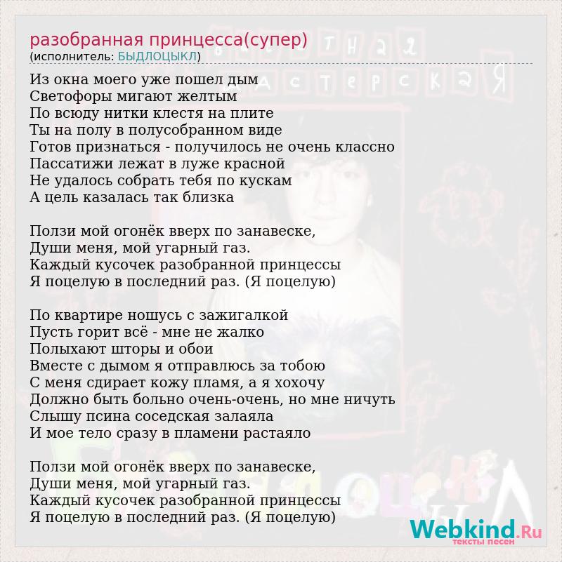 Из окна моего уже пошел дым Светофоры мигают желтым По всюду нитки клестя на плите Ты на полу в полусобранном виде Готов признаться - получилось не очень классно Пассатижи лежат в луже красной Не удалось собрать тебя по кускам А цель казалась так близка Ползи мой огонёк вверх по занавеске, Души меня, мой угарный газ. Каждый кусочек разобранной принцессы Я поцелую в последний раз. (Я поцелую) По квартире ношусь с зажигалкой Пусть горит всё - мне не жалко Полыхают шторы и обои Вместе с дымом я отправлюсь за тобою С меня сдирает кожу пламя, а я хохочу Должно быть больно очень-очень, но мне ничуть Слышу псина соседская залаяла И мое тело сразу в пламени растаяло Ползи мой огонёк вверх по занавеске, Души меня, мой угарный газ. Каждый кусочек разобранной принцессы Я поцелую в последний раз. (Я поцелую)