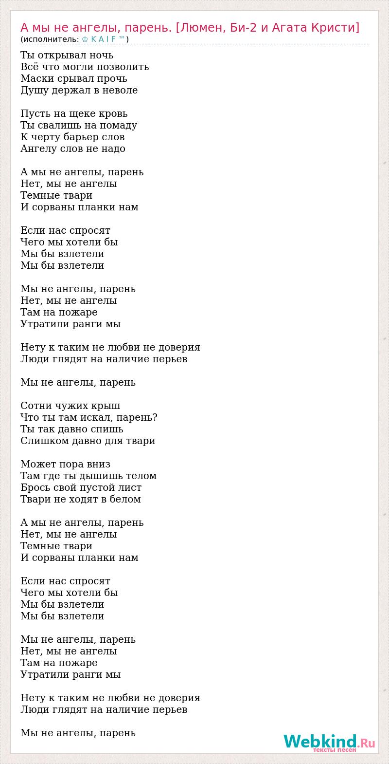 Ты открывал ночь Всё что могли позволить Маски срывал прочь Душу держал в неволе Пусть на щеке кровь Ты свалишь на помаду К черту барьер слов Ангелу слов не надо А мы не ангелы, парень Нет, мы не ангелы Темные твари И сорваны планки нам Если нас спросят Чего мы хотели бы Мы бы взлетели Мы бы взлетели Мы не ангелы, парень Нет, мы не ангелы Там на пожаре Утратили ранги мы Нету к таким не любви не доверия Люди глядят на наличие перьев Мы не ангелы, парень Сотни чужих крыш Что ты там искал, парень? Ты так давно спишь Слишком давно для твари Может пора вниз Там где ты дышишь телом Брось свой пустой лист Твари не ходят в белом А мы не ангелы, парень Нет, мы не ангелы Темные твари И сорваны планки нам Если нас спросят Чего мы хотели бы Мы бы взлетели Мы бы взлетели Мы не ангелы, парень Нет, мы не ангелы Там на пожаре Утратили ранги мы Нету к таким не любви не доверия Люди глядят на наличие перьев Мы не ангелы, парень