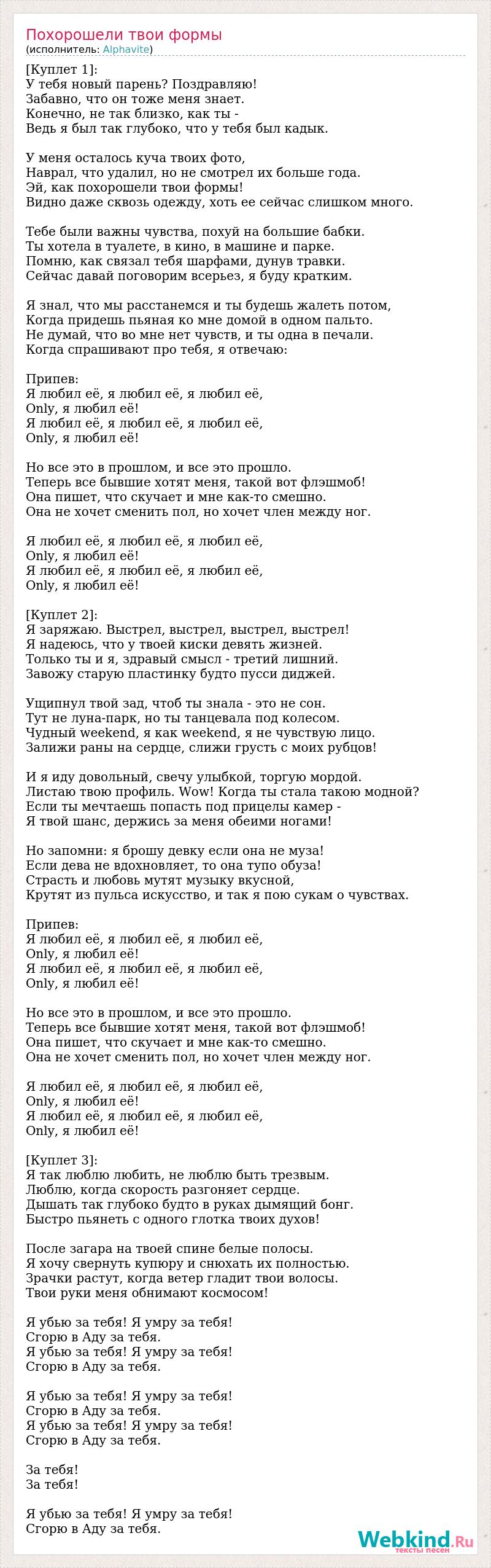 [Куплет 1]: У тебя новый парень? Поздравляю! Забавно, что он тоже меня знает. Конечно, не так близко, как ты - Ведь я был так глубоко, что у тебя был кадык. У меня осталось куча твоих фото, Наврал, что удалил, но не смотрел их больше года. Эй, как похорошели твои формы! Видно даже сквозь одежду, хоть ее сейчас слишком много. Тебе были важны чувства, похуй на большие бабки. Ты хотела в туалете, в кино, в машине и парке. Помню, как связал тебя шарфами, дунув травки. Сейчас давай поговорим всерьез, я буду кратким. Я знал, что мы расстанемся и ты будешь жалеть потом, Когда придешь пьяная ко мне домой в одном пальто. Не думай, что во мне нет чувств, и ты одна в печали. Когда спрашивают про тебя, я отвечаю: Припев: Я любил её, я любил её, я любил её, Only, я любил её! Я любил её, я любил её, я любил её, Only, я любил её! Но все это в прошлом, и все это прошло. Теперь все бывшие хотят меня, такой вот флэшмоб! Она пишет, что скучает и мне как-то смешно. Она не хочет сменить пол, но хочет член между ног. Я любил её, я любил её, я любил её, Only, я любил её! Я любил её, я любил её, я любил её, Only, я любил её! [Куплет 2]: Я заряжаю. Выстрел, выстрел, выстрел, выстрел! Я надеюсь, что у твоей киски девять жизней. Только ты и я, здравый смысл - третий лишний. Завожу старую пластинку будто пусси диджей. Ущипнул твой зад, чтоб ты знала - это не сон. Тут не луна-парк, но ты танцевала под колесом. Чудный weekend, я как weekend, я не чувствую лицо. Залижи раны на сердце, слижи грусть с моих рубцов! И я иду довольный, свечу улыбкой, торгую мордой. Листаю твою профиль. Wow! Когда ты стала такою модной? Если ты мечтаешь попасть под прицелы камер - Я твой шанс, держись за меня обеими ногами! Но запомни: я брошу девку если она не муза! Если дева не вдохновляет, то она тупо обуза! Страсть и любовь мутят музыку вкусной, Крутят из пульса искусство, и так я пою сукам о чувствах. Припев: Я любил её, я любил её, я любил её, Only, я любил её! Я любил её, я любил её, я любил её, Only, я любил её! Но все это в прошлом, и все это прошло. Теперь все бывшие хотят меня, такой вот флэшмоб! Она пишет, что скучает и мне как-то смешно. Она не хочет сменить пол, но хочет член между ног. Я любил её, я любил её, я любил её, Only, я любил её! Я любил её, я любил её, я любил её, Only, я любил её! [Куплет 3]: Я так люблю любить, не люблю быть трезвым. Люблю, когда скорость разгоняет сердце. Дышать так глубоко будто в руках дымящий бонг. Быстро пьянеть с одного глотка твоих духов! После загара на твоей спине белые полосы. Я хочу свернуть купюру и снюхать их полностью. Зрачки растут, когда ветер гладит твои волосы. Твои руки меня обнимают космосом! Я убью за тебя! Я умру за тебя! Сгорю в Аду за тебя. Я убью за тебя! Я умру за тебя! Сгорю в Аду за тебя. Я убью за тебя! Я умру за тебя! Сгорю в Аду за тебя. Я убью за тебя! Я умру за тебя! Сгорю в Аду за тебя. За тебя! За тебя! Я убью за тебя! Я умру за тебя! Сгорю в Аду за тебя.