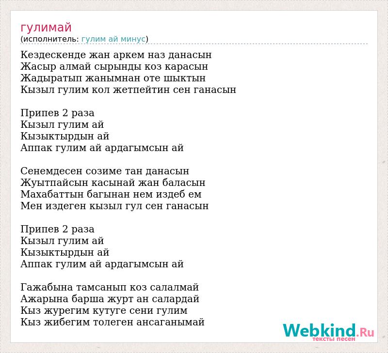 Кездескенде жан аркем наз данасын Жасыр алмай сырынды коз карасын Жадыратып жанымнан оте шыктын Кызыл гулим кол жетпейтин сен ганасын Припев 2 раза Кызыл гулим ай Кызыктырдын ай Аппак гулим ай ардагымсын ай Сенемдесен созиме тан данасын Жуытпайсын касынай жан баласын Махабаттын багынан нем издеб ем Мен издеген кызыл гул сен ганасын Припев 2 раза Кызыл гулим ай Кызыктырдын ай Аппак гулим ай ардагымсын ай Гажабына тамсанып коз салалмай Ажарына барша журт ан салардай Кыз журегим кутуге сени гулим Кыз жибегим толеген ансаганымай