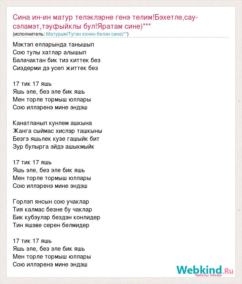 Мэктэп елларында танышып Сою тулы хатлар алышып Балачактан бик тиз киттек без Сиздерми дэ усеп життек без 17 тик 17 яшь Яшь эле, без эле бик яшь Мен торле тормыш юллары Сою иллэренэ мине эндэш Канатланып кунлем ашкына Жанга сыймас хислэр ташкыны Безгэ яшьлек кузе гашыйк бит Зур булырга эйдэ ашыкмыйк 17 тик 17 яшь Яшь эле, без эле бик яшь Мен торле тормыш юллары Сою иллэренэ мине эндэш Горлэп янсын сою учаклар Тия калмас безне бу чаклар Бик кубэулэр бездэн конлидер Тин яшэве серен белмидер 17 тик 17 яшь Яшь эле, без эле бик яшь Мен торле тормыш юллары Сою иллэренэ мине эндэш