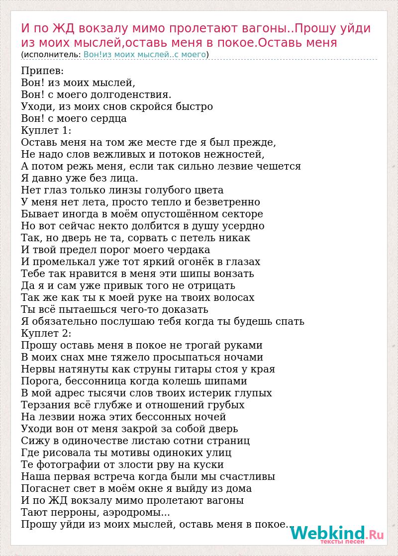 Главная→Исполнители→Вон!из моих мыслей..с моего→И по ЖД вокзалу мимо пролетают вагоны..Прошу уйди из моих мыслей,оставь меня в п