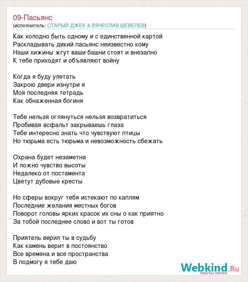 Как холодно быть одному и с единственной картой Раскладывать дикий пасьянс неизвестно кому Наши хижины жгут ваши башни стоят и внезапно К тебе приходят и объявляют войну Когда я буду улетать Закрою двери изнутри я Моя последняя тетрадь Как обнаженная богиня Тебе нельзя оглянуться нельзя возвратиться Пробивая асфальт закрываешь глаза Тебе интересно знать что чувствуют птицы Но тюрьма есть тюрьма и невозможность сбежать Охрана будет незаметна И ложно чувство высоты Недалеко от постамента Цветут дубовые кресты Но сферы вокруг тебя истекают по каплям Последние желания местных богов Поворот головы ярких красок их сны о как приятно За тобой последнее слово и вот ты готов Приятель верил ты в судьбу Как камень верит в постоянство Все времена и все пространства В подмогу я тебе даю