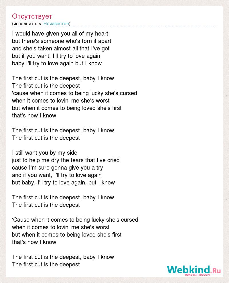 I would have given you all of my heart but there's someone who's torn it apart and she's taken almost all that I've got but if you want, I'll try to love again baby I'll try to love again but I know The first cut is the deepest, baby I know The first cut is the deepest 'cause when it comes to being lucky she's cursed when it comes to lovin' me she's worst but when it comes to being loved she's first that's how I know The first cut is the deepest, baby I know The first cut is the deepest I still want you by my side just to help me dry the tears that I've cried cause I'm sure gonna give you a try and if you want, I'll try to love again but baby, I'll try to love again, but I know The first cut is the deepest, baby I know The first cut is the deepest 'Cause when it comes to being lucky she's cursed when it comes to lovin' me she's worst but when it comes to being loved she's first that's how I know The first cut is the deepest, baby I know The first cut is the deepest