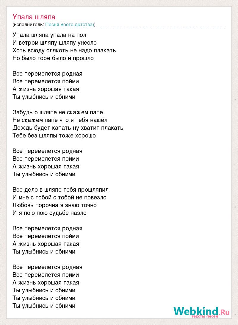 Упала шляпа упала на пол И ветром шляпу шляпу унесло Хоть всюду слякоть не надо плакать Но было горе было и прошло Все перемелется родная Все перемелется пойми А жизнь хорошая такая Ты улыбнись и обними Забудь о шляпе не скажем папе Не скажем папе что я тебя нашёл Дождь будет капать ну хватит плакать Тебе без шляпы тоже хорошо Все перемелется родная Все перемелется пойми А жизнь хорошая такая Ты улыбнись и обними Все дело в шляпе тебя прошляпил И мне с тобой с тобой не повезло Любовь порочна я знаю точно И я пою пою судьбе назло Все перемелется родная Все перемелется пойми А жизнь хорошая такая Ты улыбнись и обними Все перемелется родная Все перемелется пойми А жизнь хорошая такая Ты улыбнись и обними Ты улыбнись и обними Ты улыбнись и обними
