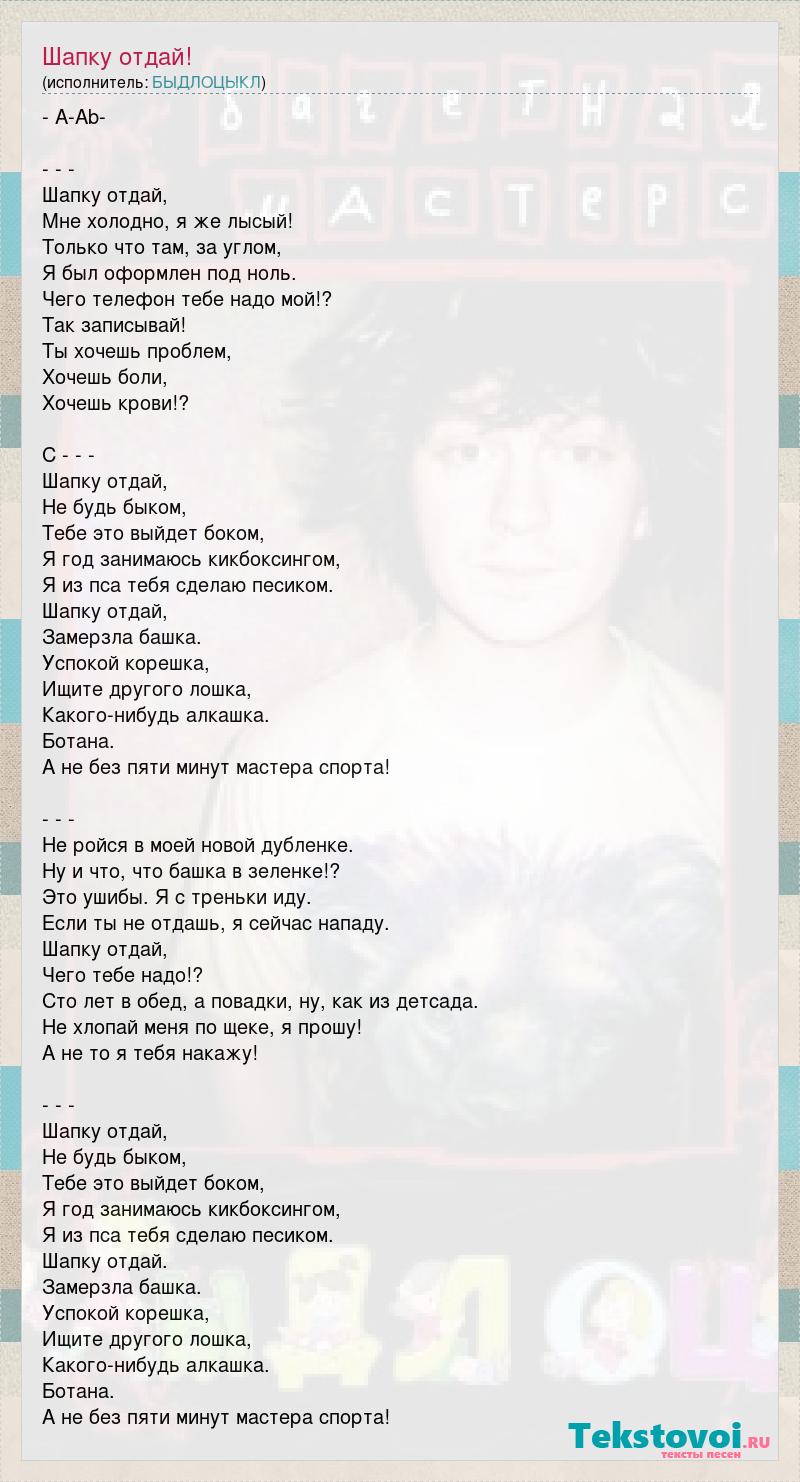 - A-Ab- - - - Шапку отдай, Мне холодно, я же лысый! Только что там, за углом, Я был оформлен под ноль. Чего телефон тебе надо мой!? Так записывай! Ты хочешь проблем, Хочешь боли, Хочешь крови!? С - - - Шапку отдай, Не будь быком, Тебе это выйдет боком, Я год занимаюсь кикбоксингом, Я из пса тебя сделаю песиком. Шапку отдай, Замерзла башка. Успокой корешка, Ищите другого лошка, Какого-нибудь алкашка. Ботана. А не без пяти минут мастера спорта! - - - Не ройся в моей новой дубленке. Ну и что, что башка в зеленке!? Это ушибы. Я с треньки иду. Если ты не отдашь, я сейчас нападу. Шапку отдай, Чего тебе надо!? Сто лет в обед, а повадки, ну, как из детсада. Не хлопай меня по щеке, я прошу! А не то я тебя накажу! - - - Шапку отдай, Не будь быком, Тебе это выйдет боком, Я год занимаюсь кикбоксингом, Я из пса тебя сделаю песиком. Шапку отдай. Замерзла башка. Успокой корешка, Ищите другого лошка, Какого-нибудь алкашка. Ботана. А не без пяти минут мастера спорта!