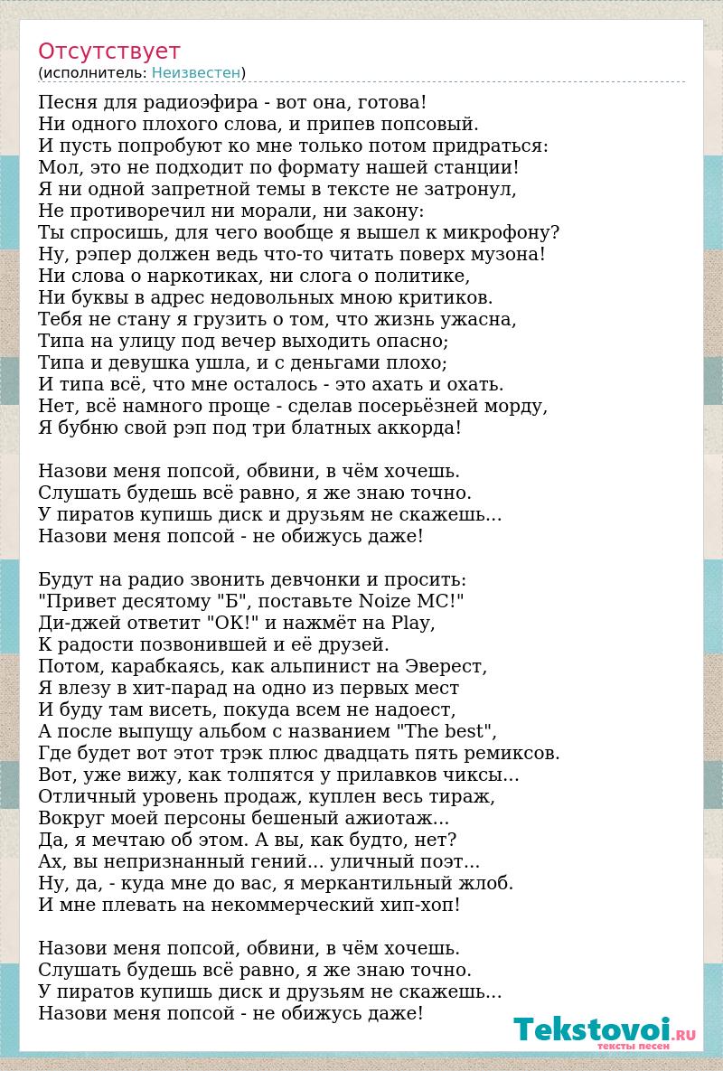 Песня для радиоэфира - вот она, готова! Ни одного плохого слова, и припев попсовый. И пусть попробуют ко мне только потом придраться: Мол, это не подходит по формату нашей станции! Я ни одной запретной темы в тексте не затронул, Не противоречил ни морали, ни закону: Ты спросишь, для чего вообще я вышел к микрофону? Ну, рэпер должен ведь что-то читать поверх музона! Ни слова о наркотиках, ни слога о политике, Ни буквы в адрес недовольных мною критиков. Тебя не стану я грузить о том, что жизнь ужасна, Типа на улицу под вечер выходить опасно; Типа и девушка ушла, и с деньгами плохо; И типа всё, что мне осталось - это ахать и охать. Нет, всё намного проще - сделав посерьёзней морду, Я бубню свой рэп под три блатных аккорда! Назови меня попсой, обвини, в чём хочешь. Слушать будешь всё равно, я же знаю точно. У пиратов купишь диск и друзьям не скажешь... Назови меня попсой - не обижусь даже! Будут на радио звонить девчонки и просить: "Привет десятому "Б", поставьте Noize MC!" Ди-джей ответит "ОК!" и нажмёт на Play, К радости позвонившей и её друзей. Потом, карабкаясь, как альпинист на Эверест, Я влезу в хит-парад на одно из первых мест И буду там висеть, покуда всем не надоест, А после выпущу альбом с названием "The best", Где будет вот этот трэк плюс двадцать пять ремиксов. Вот, уже вижу, как толпятся у прилавков чиксы... Отличный уровень продаж, куплен весь тираж, Вокруг моей персоны бешеный ажиотаж... Да, я мечтаю об этом. А вы, как будто, нет? Ах, вы непризнанный гений... уличный поэт... Ну, да, - куда мне до вас, я меркантильный жлоб. И мне плевать на некоммерческий хип-хоп! Назови меня попсой, обвини, в чём хочешь. Слушать будешь всё равно, я же знаю точно. У пиратов купишь диск и друзьям не скажешь... Назови меня попсой - не обижусь даже!