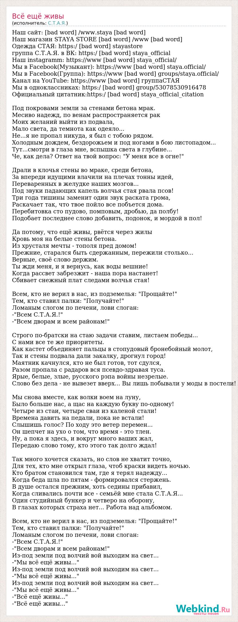 Наш сайт: [bad word] /www.staya [bad word] Наш магазин STAYA STORE [bad word] /www [bad word] Одежда СТАЯ: https:/ [bad word] stayastore группа С.Т.А.Я. в ВК: https:/ [bad word] staya_official Наш instagramm: https://www [bad word] staya_official/ Мы в Facebook(Музыкант): https://www [bad word] staya.official/ Мы в Facebook(Группа): https://www [bad word] groups/staya.official/ Канал на YouTube: https://www [bad word] группаСТАЯ Мы в одноклассниках: https:/ [bad word] group/53078530916478 Официальный цитатник:https:/ [bad word] staya_official_citation Под покровами земли за стенами бетона мрак. Месиво надежд, по венам распространяется рак Моих желаний выйти из подвала, Мало света, да темнота как одеяло... Не...я не пропал никуда, я был с тобою рядом. Холодным дождем, бездорожьем и под ногами в бою листопадом... Тут...смотри в глаза мне, вспышка света в глубине... Че, как дела? Ответ на твой вопрос: "У меня все в огне!" Драли в клочья стены во мраке, среди бетона, За впереди идущими влачили на плечах тонны идей, Переваренных в желудке наших мозгов... Под звуки падающих капель волчья стая рвала псов! Три года тишины заменит один звук раската грома, Раскачает так, что твое пойло все побъется дома. Перебитовка сто пудово, помповым, дробью, да полбу! Подобает последнее слово добавить, подонок, и мордой в пол! Да потому, что ещё живы, рвётся через жилы Кровь моя на белые стены бетона. Из хрусталя мечты - тополя пред домом! Прежние, старался быть сдержанным, пережили столько... Верные, своё слово держим. Ты жди меня, и я вернусь, как воды вешние! Когда рассвет забрезжит - наша пора настанет! Сбивает снежный плат следами волчья стая! Всем, кто не верил в нас, из подземелья: "Прощайте!" Тем, кто ставил палки: "Получайте!" Ломаным слогом по печени, лови слоган: -"Всем C.Т.А.Я.!" -"Всем дворам и всем районам!" Строго по-братски на стаю задачи ставим, листаем победы... С нами все те же приоритеты. Как кастет объединяет пальцы в стопудовый бронебойный молот, Так и стены подвала дали закалку, дрогнул город! Маятник качнулся, кто не был готов, тот сдулся, Разом пропала с радаров вся псевдо-здравая туса. Ярые, белые, злые, русского рэпа войны незрелые. Слово без дела - не вывезет вверх... Вы лишь побывали у моды в постели! Мы снова вместе, как волки воем на луну, Было больше нас, а щас на каждую букву по-одному! Четыре из стаи, четыре сваи из каленой стали! Времена давить на педали, пока не встали! Слышишь голос? По ходу это ветер перемен... Он шепчет на ухо о том, что время - это тлен. Ну, а пока я здесь, и вокруг много ваших жал, Передаю слово тому, кто этого так долго ждал! Так много хочется сказать, но слов не хватит точно, Для тех, кто мне открыл глаза, чтоб краски видеть ночью. Кто братом становился там, где я терял надежду... Когда беда шла по пятам - формировался стержень. В душе остался прежним, хоть седины прибавил, Когда сливались почти все - семьёй мне стала С.Т.А.Я... Один студийный бункер и четверо на оборону, В глазах которых страха нет... Работа над альбомом. Всем, кто не верил в нас, из подземелья: "Прощайте!" Тем, кто ставил палки: "Получайте!" Ломаным слогом по печени, лови слоган: -"Всем C.Т.А.Я.!" -"Всем дворам и всем районам!" Из-под земли под волчий вой выходим на свет... -"Мы всё ещё живы..." Из-под земли под волчий вой выходим на свет... -"Мы всё ещё живы..." Из-под земли под волчий вой выходим на свет... -"Мы всё ещё живы..." -"Всё ещё живы..." -"Всё ещё живы..."