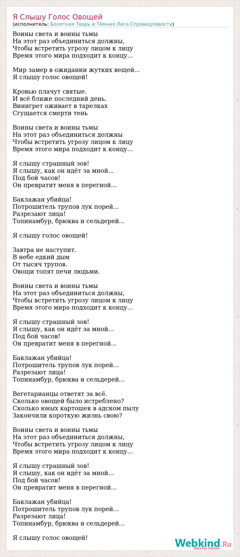 Воины света и воины тьмы На этот раз объединиться должны, Чтобы встретить угрозу лицом к лицу Время этого мира подходит к концу... Мир замер в ожидании жутких вещей... Я слышу голос овощей! Кровью плачут святые. И всё ближе последний день. Винигрет оживает в тарелках Сгущается смерти тень Воины света и воины тьмы На этот раз объединиться должны Чтобы встретить угрозу лицом к лицу Время этого мира подходит к концу... Я слышу страшный зов! Я слышу, как он идёт за мной... Под бой часов! Он превратит меня в перегной... Баклажан убийца! Потрошитель трупов лук порей... Разрезают лица! Топинамбур, брюква и сельдерей... Я слышу голос овощей! Завтра не наступит. В небе едкий дым От тысяч трупов. Овощи топят печи людьми. Воины света и воины тьмы На этот раз объединиться должны, Чтобы встретить угрозу лицом к лицу Время этого мира подходит к концу... Я слышу страшный зов! Я слышу, как он идёт за мной... Под бой часов! Он превратит меня в перегной... Баклажан убийца! Потрошитель трупов лук порей... Разрезают лица! Топинамбур, брюква и сельдерей... Вегетарианцы ответят за всё. Сколько овощей было истреблено? Сколько юных картошек в адском пылу Закончили короткую жизнь свою? Воины света и воины тьмы На этот раз объединиться должны, Чтобы встретить угрозу лицом к лицу Время этого мира подходит к концу... Я слышу страшный зов! Я слышу, как он идёт за мной... Под бой часов! Он превратит меня в перегной... Баклажан убийца! Потрошитель трупов лук порей... Разрезают лица! Топинамбур, брюква и сельдерей... Я слышу голос овощей!