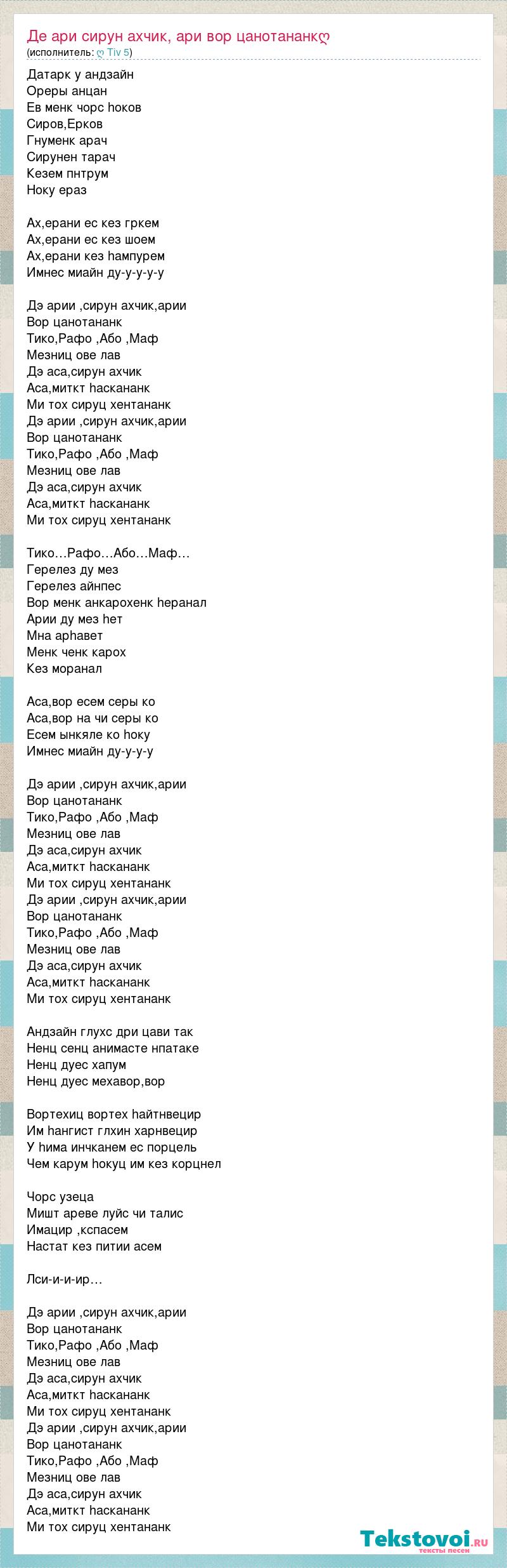 Датарк у андзайн Ореры анцан Ев менк чорс hоков Сиров,Ерков Гнуменк арач Сирунен тарач Кезем пнтрум Hоку ераз Ах,ерани ес кез гркем Ах,ерани ес кез шоем Ах,ерани кез hампурем Имнес миайн ду-у-у-у-у Дэ арии ,сирун ахчик,арии Вор цанотананк Тико,Рафо ,Або ,Маф Мезниц ове лав Дэ аса,сирун ахчик Аса,миткт hаскананк Ми тох сируц хентананк Дэ арии ,сирун ахчик,арии Вор цанотананк Тико,Рафо ,Або ,Маф Мезниц ове лав Дэ аса,сирун ахчик Аса,миткт hаскананк Ми тох сируц хентананк Тико…Рафо…Або…Маф… Герелез ду мез Герелез айнпес Вор менк анкарохенк hеранал Арии ду мез hет Мна арhавет Менк ченк карох Кез моранал Аса,вор есем серы ко Аса,вор на чи серы ко Есем ынкяле ко hоку Имнес миайн ду-у-у-у Дэ арии ,сирун ахчик,арии Вор цанотананк Тико,Рафо ,Або ,Маф Мезниц ове лав Дэ аса,сирун ахчик Аса,миткт hаскананк Ми тох сируц хентананк Дэ арии ,сирун ахчик,арии Вор цанотананк Тико,Рафо ,Або ,Маф Мезниц ове лав Дэ аса,сирун ахчик Аса,миткт hаскананк Ми тох сируц хентананк Андзайн глухс дри цави так Hенц сенц анимасте нпатаке Hенц дуес хапум Hенц дуес мехавор,вор Вортехиц вортех hайтнвецир Им hангист глхин харнвецир У hима инчканем ес порцель Чем карум hокуц им кез корцнел Чорс узеца Мишт ареве луйс чи талис Имацир ,кспасем Hастат кез питии асем Лси-и-и-ир… Дэ арии ,сирун ахчик,арии Вор цанотананк Тико,Рафо ,Або ,Маф Мезниц ове лав Дэ аса,сирун ахчик Аса,миткт hаскананк Ми тох сируц хентананк Дэ арии ,сирун ахчик,арии Вор цанотананк Тико,Рафо ,Або ,Маф Мезниц ове лав Дэ аса,сирун ахчик Аса,миткт hаскананк Ми тох сируц хентананк