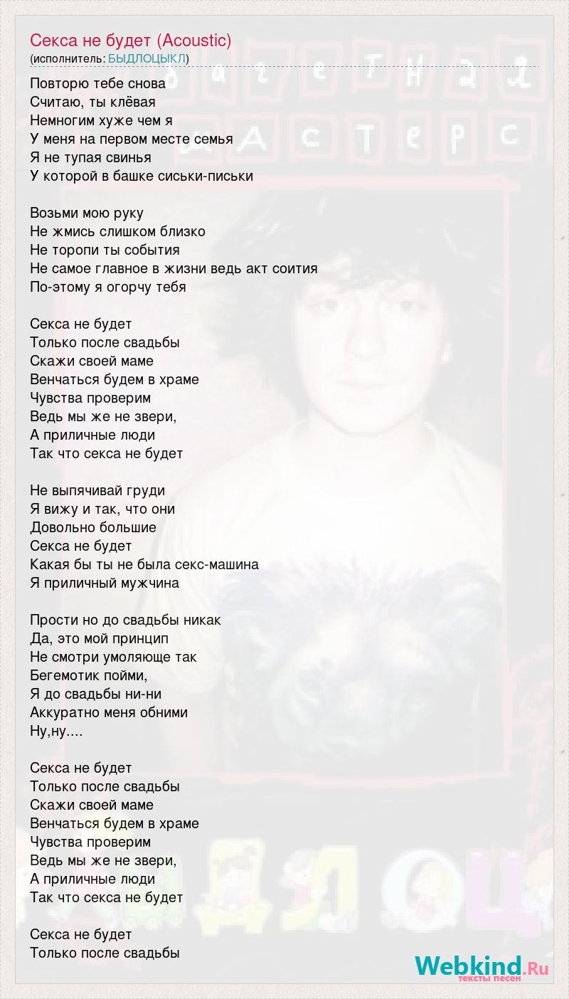 Повторю тебе снова Считаю, ты клёвая Немногим хуже чем я У меня на первом месте семья Я не тупая свинья У которой в башке сиськи-письки Возьми мою руку Не жмись слишком близко Не торопи ты события Не самое главное в жизни ведь акт соития По-этому я огорчу тебя Секса не будет Только после свадьбы Скажи своей маме Венчаться будем в храме Чувства проверим Ведь мы же не звери, А приличные люди Так что секса не будет Не выпячивай груди Я вижу и так, что они Довольно большие Секса не будет Какая бы ты не была секс-машина Я приличный мужчина Прости но до свадьбы никак Да, это мой принцип Не смотри умоляюще так Бегемотик пойми, Я до свадьбы ни-ни Аккуратно меня обними Ну,ну.... Секса не будет Только после свадьбы Скажи своей маме Венчаться будем в храме Чувства проверим Ведь мы же не звери, А приличные люди Так что секса не будет Секса не будет Только после свадьбы