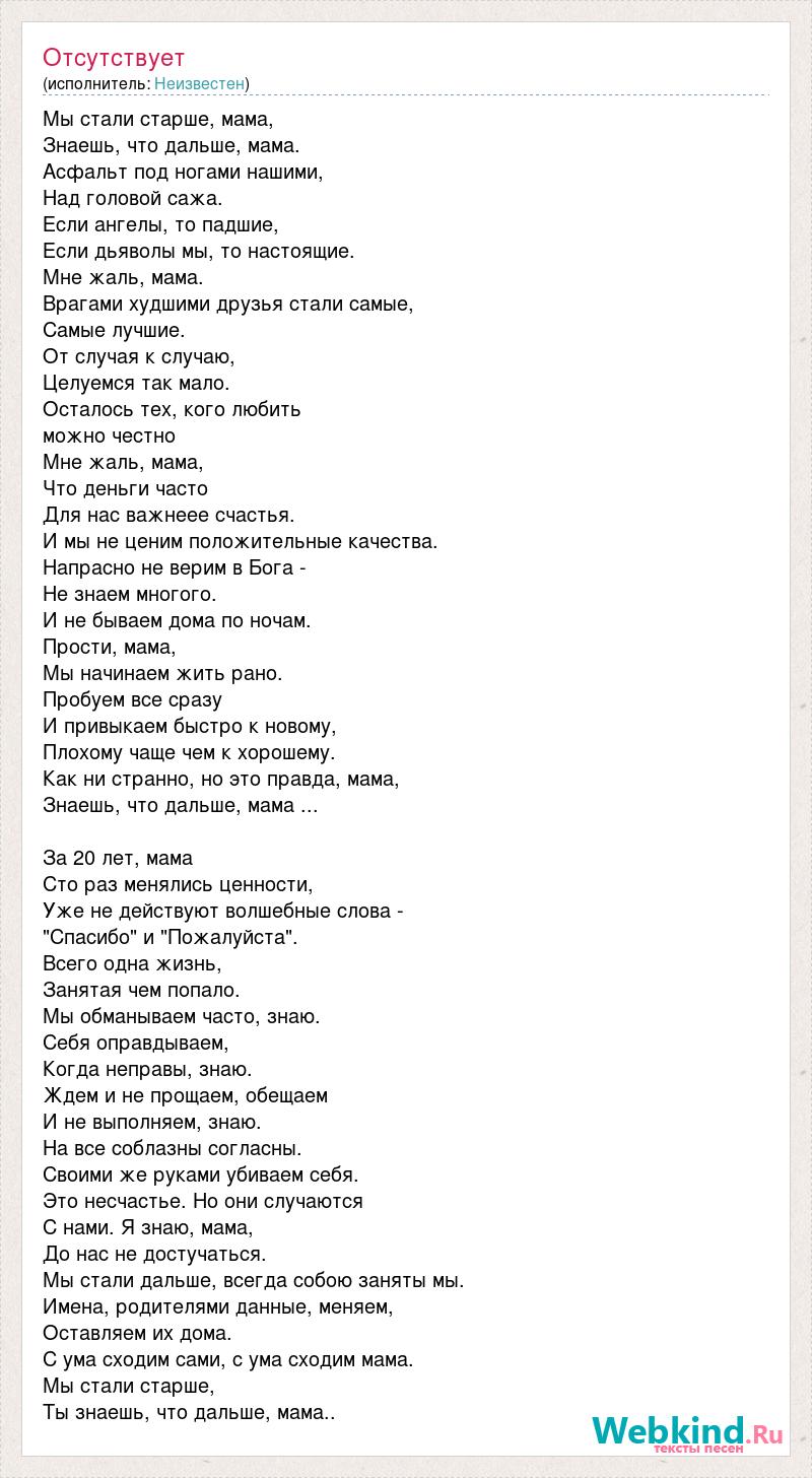 Мы стали старше, мама, Знаешь, что дальше, мама. Асфальт под ногами нашими, Над головой сажа. Если ангелы, то падшие, Если дьяволы мы, то настоящие. Мне жаль, мама. Врагами худшими друзья стали самые, Самые лучшие. От случая к случаю, Целуемся так мало. Осталось тех, кого любить можно честно Мне жаль, мама, Что деньги часто Для нас важнеее счастья. И мы не ценим положительные качества. Напрасно не верим в Бога - Не знаем многого. И не бываем дома по ночам. Прости, мама, Мы начинаем жить рано. Пробуем все сразу И привыкаем быстро к новому, Плохому чаще чем к хорошему. Как ни странно, но это правда, мама, Знаешь, что дальше, мама ... За 20 лет, мама Сто раз менялись ценности, Уже не действуют волшебные слова - "Спасибо" и "Пожалуйста". Всего одна жизнь, Занятая чем попало. Мы обманываем часто, знаю. Себя оправдываем, Когда неправы, знаю. Ждем и не прощаем, обещаем И не выполняем, знаю. На все соблазны согласны. Своими же руками убиваем себя. Это несчастье. Но они случаются С нами. Я знаю, мама, До нас не достучаться. Мы стали дальше, всегда собою заняты мы. Имена, родителями данные, меняем, Оставляем их дома. С ума сходим сами, с ума сходим мама. Мы стали старше, Ты знаешь, что дальше, мама..