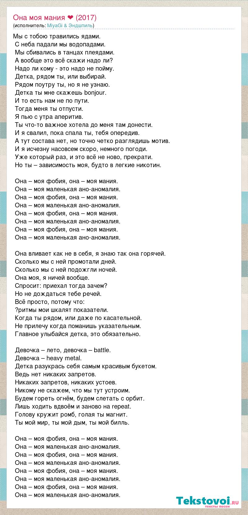 Мы с тобою травились ядами. С неба падали мы водопадами. Мы сбивались в танцах плеядами. А вообще это всё скажи надо ли? Надо ли кому - это надо не пойму. Детка, рядом ты, или выбирай. Рядом поутру ты, но я не узнаю. Детка ты мне скажешь bonjour. И то есть нам не по пути. Тогда меня ты отпусти. Я пью с утра аперитив. Ты что-то важное хотела до меня там донести. И я свалил, пока спала ты, тебя опередив. А тут состава нет, но точно четко разглядишь мотив. И я исчезну насовсем скоро, немного погоди. Уже который раз, и это всё не ново, прекрати. Но ты – зависимость моя, будто в легкие никотин. Она – моя фобия, она – моя мания. Она – моя маленькая ано-аномалия. Она – моя фобия, она – моя мания. Она – моя маленькая ано-аномалия. Она – моя фобия, она – моя мания. Она – моя маленькая ано-аномалия. Она – моя фобия, она – моя мания. Она – моя маленькая ано-аномалия. Она вливает как не в себя, я знаю так она горячей. Сколько мы с ней промотали дней. Сколько мы с ней подожгли ночей. Она моя, я ничей вообще. Спросит: приехал тогда зачем? Но не дождаться тебе речей. Всё просто, потому что: ?ритмы мои шкалят показатели. Когда ты рядом, или даже по касательной. Не прилечу когда поманишь указательным. Главное улыбайся детка, это обязательно. Девочка – лето, девочка – battle. Девочка – heavy metal. Детка разукрась себя самым красивым букетом. Ведь нет никаких запретов. Никаких запретов, никаких устоев. Никому не скажем, что мы тут устроим. Будем гореть огнём, будем слетать с орбит. Лишь ходить вдвоём и заново на repeat. Голову кружит ромб, голая ты магнит. Ты мой мир, ты мой дым, ты мой билль. Она – моя фобия, она – моя мания. Она – моя маленькая ано-аномалия. Она – моя фобия, она – моя мания. Она – моя маленькая ано-аномалия. Она – моя фобия, она – моя мания. Она – моя маленькая ано-аномалия. Она – моя фобия, она – моя мания. Она – моя маленькая ано-аномалия.