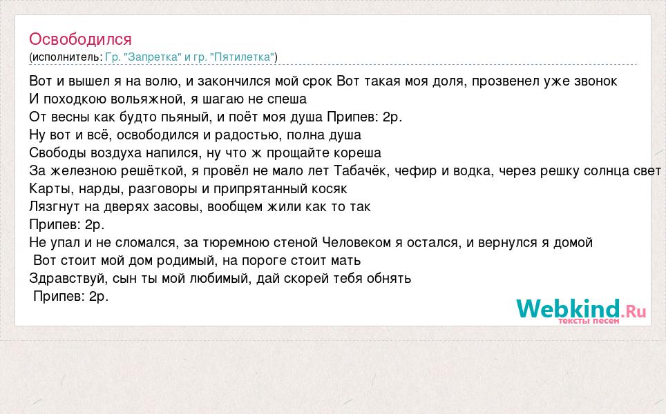 Вот и вышел я на волю, и закончился мой срок Вот такая моя доля, прозвенел уже звонок И походкою вольяжной, я шагаю не спеша От весны как будто пьяный, и поёт моя душа Припев: 2р. Ну вот и всё, освободился и радостью, полна душа Свободы воздуха напился, ну что ж прощайте кореша За железною решёткой, я провёл не мало лет Табачёк, чефир и водка, через решку солнца свет Карты, нарды, разговоры и припрятанный косяк Лязгнут на дверях засовы, вообщем жили как то так Припев: 2р. Не упал и не сломался, за тюремною стеной Человеком я остался, и вернулся я домой Вот стоит мой дом родимый, на пороге стоит мать Здравствуй, сын ты мой любимый, дай скорей тебя обнять Припев: 2р.