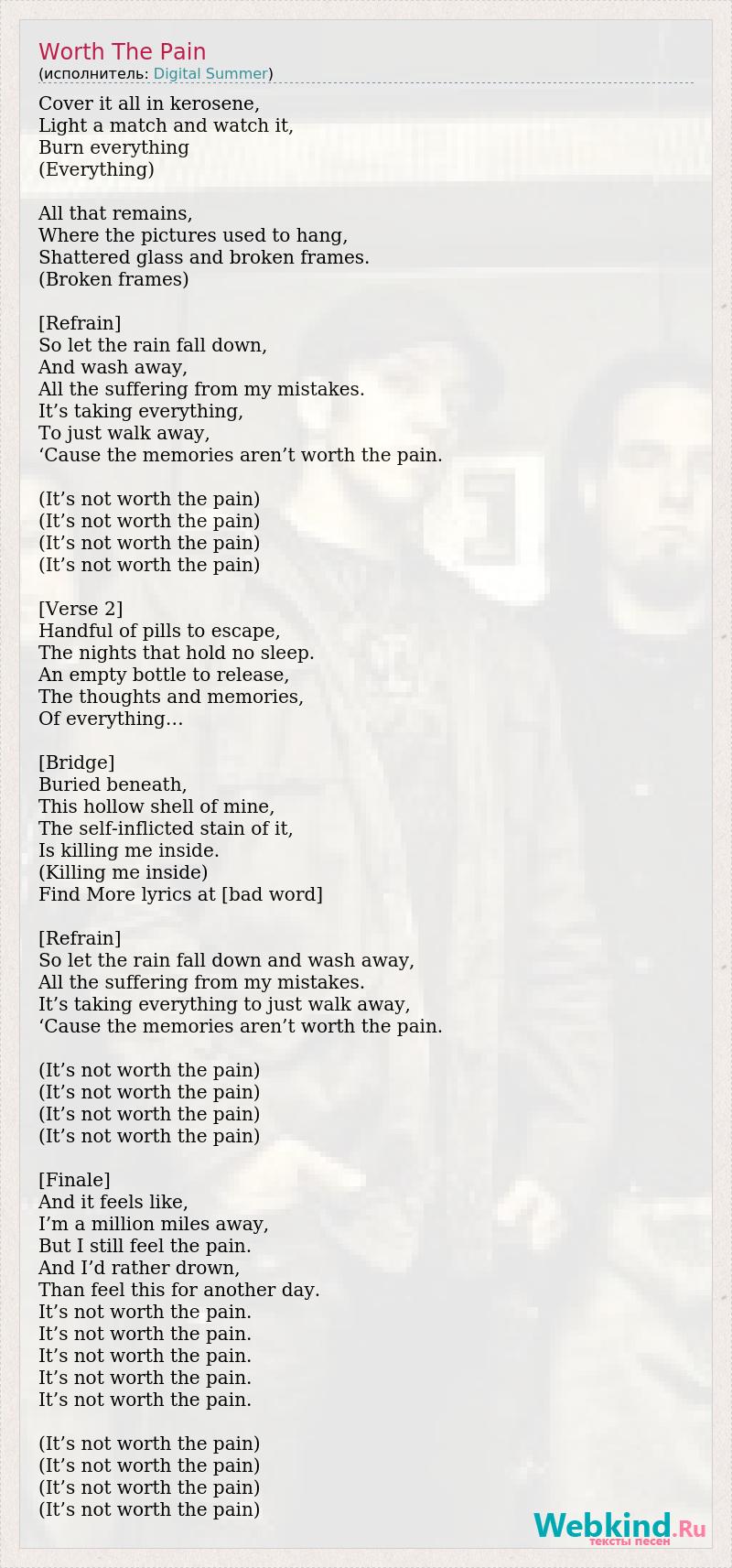 Cover it all in kerosene, Light a match and watch it, Burn everything (Everything) All that remains, Where the pictures used to hang, Shattered glass and broken frames. (Broken frames) [Refrain] So let the rain fall down, And wash away, All the suffering from my mistakes. It’s taking everything, To just walk away, ‘Cause the memories aren’t worth the pain. (It’s not worth the pain) (It’s not worth the pain) (It’s not worth the pain) (It’s not worth the pain) [Verse 2] Handful of pills to escape, The nights that hold no sleep. An empty bottle to release, The thoughts and memories, Of everything… [Bridge] Buried beneath, This hollow shell of mine, The self-inflicted stain of it, Is killing me inside. (Killing me inside) Find More lyrics at [bad word] [Refrain] So let the rain fall down and wash away, All the suffering from my mistakes. It’s taking everything to just walk away, ‘Cause the memories aren’t worth the pain. (It’s not worth the pain) (It’s not worth the pain) (It’s not worth the pain) (It’s not worth the pain) [Finale] And it feels like, I’m a million miles away, But I still feel the pain. And I’d rather drown, Than feel this for another day. It’s not worth the pain. It’s not worth the pain. It’s not worth the pain. It’s not worth the pain. It’s not worth the pain. (It’s not worth the pain) (It’s not worth the pain) (It’s not worth the pain) (It’s not worth the pain)