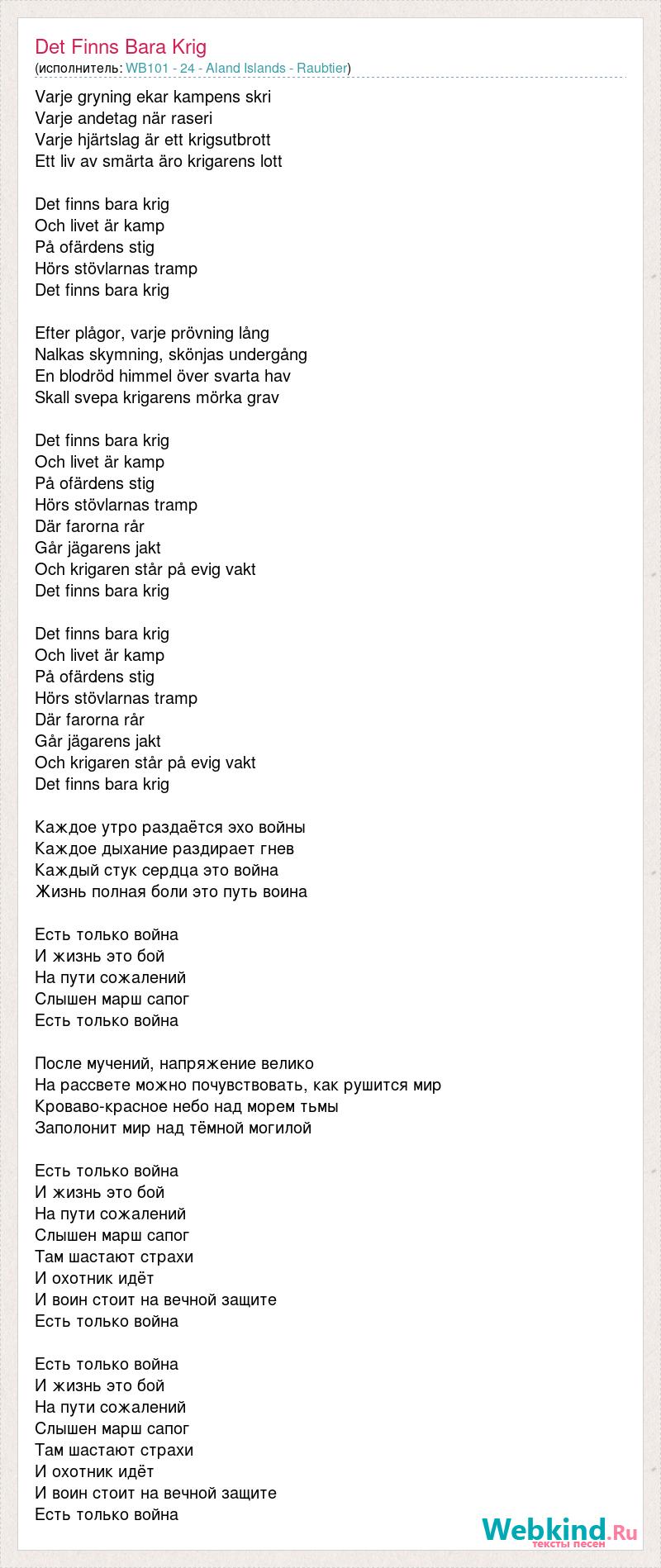 Varje gryning ekar kampens skri Varje andetag när raseri Varje hjärtslag är ett krigsutbrott Ett liv av smärta äro krigarens lott Det finns bara krig Och livet är kamp På ofärdens stig Hörs stövlarnas tramp Det finns bara krig Efter plågor, varje prövning lång Nalkas skymning, skönjas undergång En blodröd himmel över svarta hav Skall svepa krigarens mörka grav Det finns bara krig Och livet är kamp På ofärdens stig Hörs stövlarnas tramp Där farorna rår Går jägarens jakt Och krigaren står på evig vakt Det finns bara krig Det finns bara krig Och livet är kamp På ofärdens stig Hörs stövlarnas tramp Där farorna rår Går jägarens jakt Och krigaren står på evig vakt Det finns bara krig Каждое утро раздаётся эхо войны Каждое дыхание раздирает гнев Каждый стук сердца это война Жизнь полная боли это путь воина Есть только война И жизнь это бой На пути сожалений Слышен марш сапог Есть только война После мучений, напряжение велико На рассвете можно почувствовать, как рушится мир Кроваво-красное небо над морем тьмы Заполонит мир над тёмной могилой Есть только война И жизнь это бой На пути сожалений Слышен марш сапог Там шастают страхи И охотник идёт И воин стоит на вечной защите Есть только война Есть только война И жизнь это бой На пути сожалений Слышен марш сапог Там шастают страхи И охотник идёт И воин стоит на вечной защите Есть только война